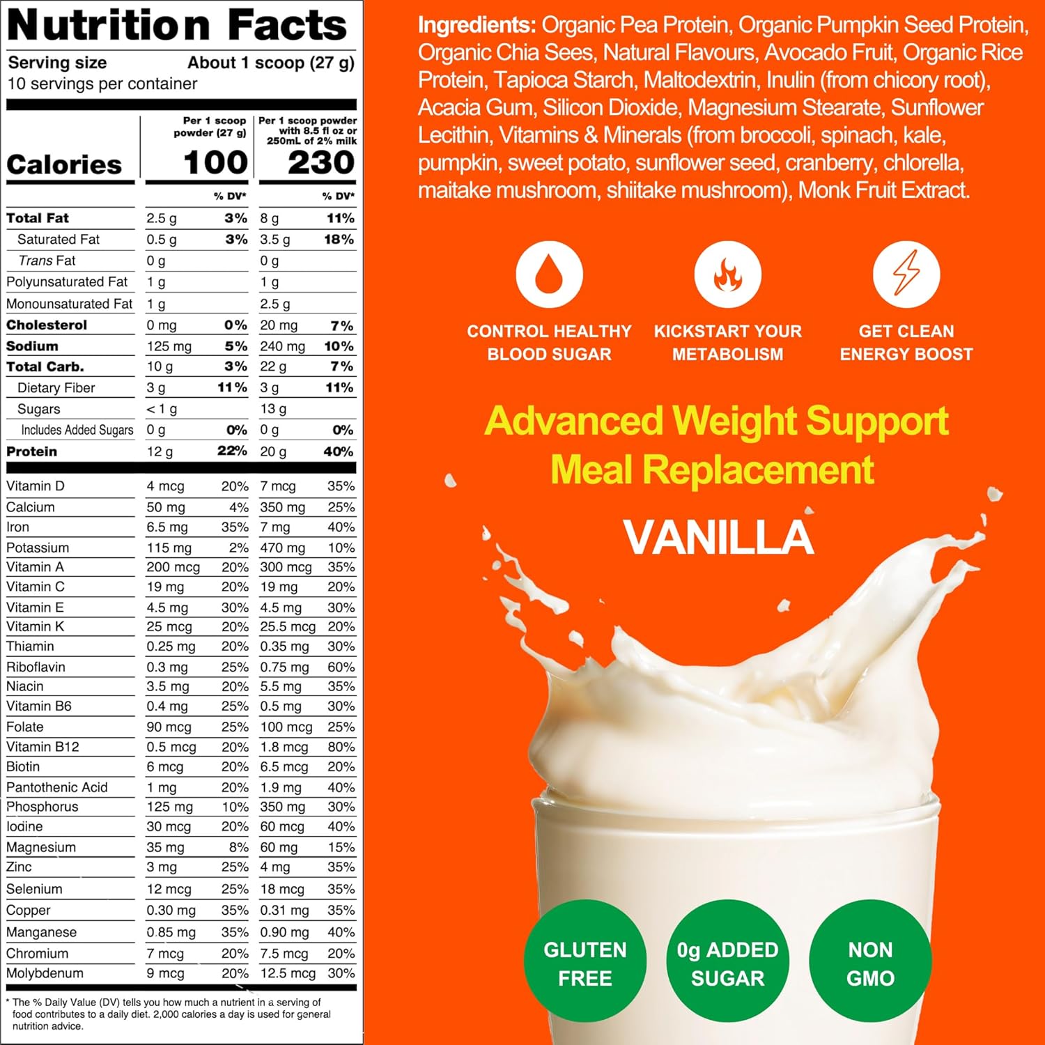 About this item A Nutritious Way to Fuel Your Day: Packed with bioactive AvoB and 26 wholefood vitamins and minerals, our protein shake promotes nourishment. This protein drink contains the goodness of avocados; it’s a potent solution to support optimum body function. Sustained Satisfaction: Satisfy hunger every time you drink our delicious protein shakes. Designed to promote a well-rounded diet, each scoop of our meal replacement powder can be whipped into a keto meal replacement shake you can enjoy anytime, anywhere. Vegan Meal Replacement for Digestive Harmony: Loaded with 3g prebiotic fiber, our protein shakes for women /men are healthy lunch, dinner, or breakfast essentials that support gut health. Each serving provides a lasting sense of fullness and satisfaction. Plant-Powered Nutrition: Enjoy vanilla or chocolate protein shakes packed with wholesome plant-based ingredients - kale, chlorella, broccoli, and more. Our nutritionally balanced protein shake powder provides a holistic approach to support wellness. Powerful, Clean Protein: Formulated for weight management support, each scoop of our US-crafted high protein powder delivers 12g of plant-based protein. Mixing 8.5 fl oz of 2% milk can boost high protein content to 20g per serving. See more product details,A Nutritious Way to Fuel Your Day: Packed with bioactive AvoB and 26 wholefood vitamins and minerals, our protein shake promotes nourishment. This protein drink contains the goodness of avocados; it’s a potent solution to support optimum body function,Sustained Satisfaction: Satisfy hunger every time you drink our delicious protein shakes. Designed to promote a well-rounded diet, each scoop of our meal replacement powder can be whipped into a keto meal replacement shake you can enjoy anytime, anywhere,Vegan Meal Replacement for Digestive Harmony: Loaded with 3g prebiotic fiber, our protein shakes for women /men are healthy lunch, dinner, or breakfast essentials that support gut health. Each serving provides a lasting sense of fullness and satisfaction,Plant-Powered Nutrition: Enjoy vanilla or chocolate protein shakes packed with wholesome plant-based ingredients - kale, chlorella, broccoli, and more. Our nutritionally balanced protein shake powder provides a holistic approach to support wellness,Powerful, Clean Protein: Formulated for weight management support, each scoop of our US-crafted high protein powder delivers 12g of plant-based protein. Mixing 8.5 fl oz of 2% milk can boost high protein content to 20g per serving