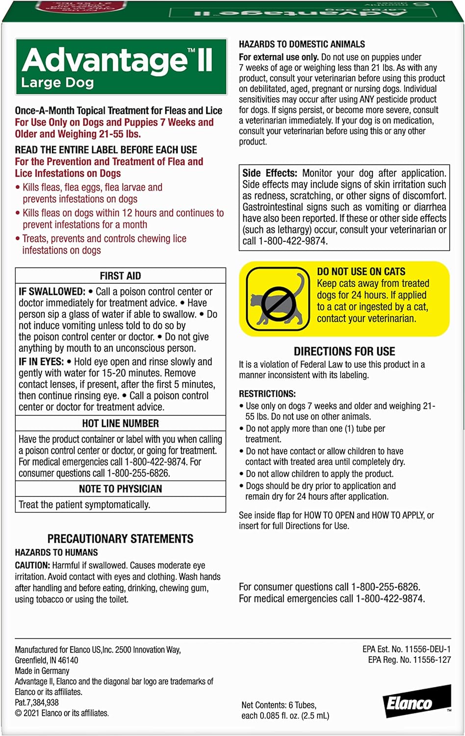 Product Description Advantage Ii Large Dog Is The Vet-Recommended Prevention And Treatment Of Flea And Lice Infestations In Dogs. Advantage Ii Large Dog Flea Treatment And Prevention Kills Adult Fleas, Flea Larvae And Flea Eggs To Deliver Total Flea Protection To Your Dog Or Puppy. In Fact, Within 12 Hours Of Application, Advantage Ii Large Dog Topical Treatment Gets Straight To Work Killing Fleas Through Contact, So They Don’T Have To Bite Your Dog To Die. This 30-Day Treatment Effectively Breaks The Flea Life Cycle, Controlling Existing Flea And Lice Infestations And Preventing Further Infestations All Month Long. Fleas Not Only Cause Discomfort; They Can Also Pose Other Health Risks. Monthly Use Of Advantage Ii Large Dog Is Important To Protect Your Dog Against Fleas That May Cause Transmission Of Tapeworms In Dogs, Flea Allergy Dermatitis And Flea Bite Anemia. That’S Why Advantage Ii Topical, Spot-On Formula Makes Application Simple - Going On In Seconds. It'S Easier Than A Flea Collar And There Are No Hard-To-Swallow Pills. You’Ll Also Love That Advantage Ii Is Fragrance-Free And Waterproof After 24 Hours Of Application. Check The Product Label For Information On Application And Potential Side Effects. Advantage Ii Large Dog Flea And Lice Protection Is Effective On Both Indoor And Outdoor Dogs. Your Dog Should Be At Least 7 Weeks Old And Weigh 21 To 55 Lbs. To Use Advantage Ii Large Dog. For The Ultimate Convenience In Care, Advantage Ii Large Dog Is Available Over The Counter – No Prescription Needed. And, You Can Stock Up With A Subscription For Regular Doorstep Deliveries So You Never Miss A Monthly Treatment. Once Advantage Ii Large Dog Is Applied, Your Dog Is Ready To Get Right Back To Exploring His Favorite Places – From The Backyard To The Dog Park. Advantage Ii Large Dog Is A Trademark Of Elanco Or Its Affiliates. Brand Story By Advantage