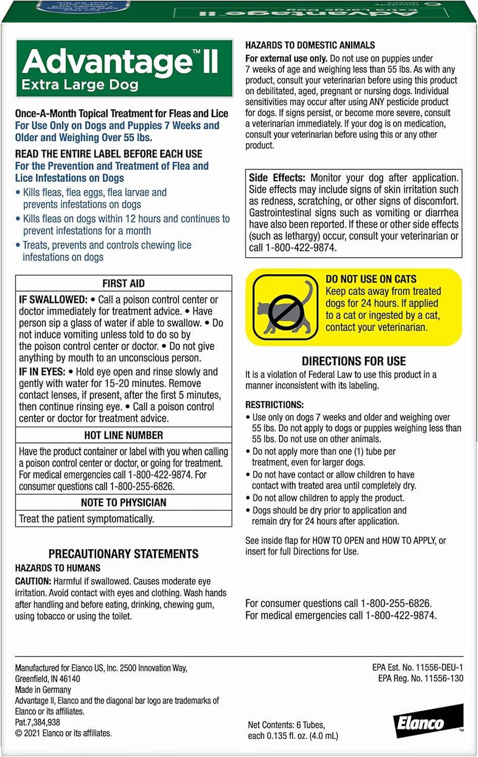 Advantage Ii Extra Large Dog Is The Vet-Recommended Prevention And Treatment Of Flea And Lice Infestations In Dogs. Advantage Ii Extra Large Dog Flea Treatment And Prevention Kills Adult Fleas, Flea Larvae And Flea Eggs To Deliver Total Flea Protection To Your Dog Or Puppy. In Fact, Within 12 Hours Of Application, Advantage Ii Extra Large Dog Topical Treatment Gets Straight To Work Killing Fleas Through Contact, So They Don’T Have To Bite Your Dog To Die. This 30-Day Treatment Effectively Breaks The Flea Life Cycle, Controlling Existing Flea And Lice Infestations And Preventing Further Infestations All Month Long. Fleas Not Only Cause Discomfort; They Can Also Pose Other Health Risks. Monthly Use Of Advantage Ii Extra Large Dog Is Important To Protect Your Dog Against Fleas That May Cause Transmission Of Tapeworms In Dogs, Flea Allergy Dermatitis And Flea Bite Anemia. That’S Why Advantage Ii Topical, Spot-On Formula Makes Application Simple - Going On In Seconds. It'S Easier Than A Flea Collar And There Are No Hard-To-Swallow Pills. You’Ll Also Love That Advantage Ii Is Fragrance-Free And Waterproof After 24 Hours Of Application. Check The Product Label For Information On Application And Potential Side Effects. Advantage Ii Extra Large Dog Flea And Lice Protection Is Effective On Both Indoor And Outdoor Dogs. Your Dog Should Be At Least 7 Weeks Old And Weigh Over 55 Lbs. To Use Advantage Ii Extra Large Dog. For The Ultimate Convenience In Care, Advantage Ii Extra Large Dog Is Available Over The Counter – No Prescription Needed. And, You Can Stock Up With A Subscription For Regular Doorstep Deliveries So You Never Miss A Monthly Treatment. Once Advantage Ii Extra Large Dog Is Applied, Your Dog Is Ready To Get Right Back To Exploring His Favorite Places – From The Backyard To The Dog Park. Advantage Ii Extra Large Dog Is A Trademark Of Elanco Or Its Affiliates