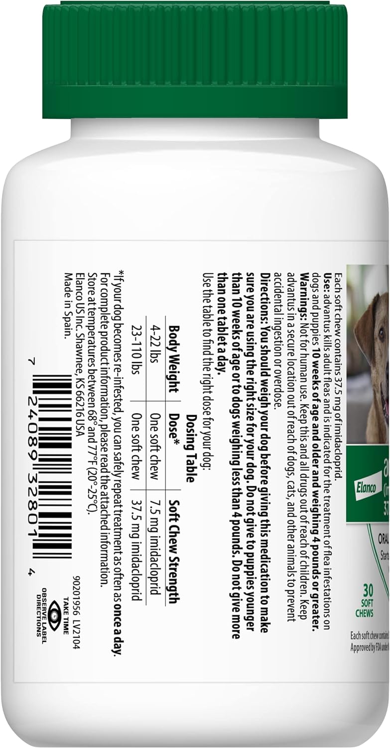 Say Goodbye To Pesky Fleas With Advantus (Imidacloprid). This Powerful Flea Treatment Provides Fast And Effective Relief For Your Furry Friend. A Single Dose Of Advantus Soft Chews Starts Killing Adult Fleas Within One Hour. And It'S Out Of Their System In 24-Hours,* So Your Dog Can Get Back To Enjoying Life. If There Are Fleas In Your Dog'S Environment And Your Dog Becomes Re-Infested, You Can Safely Repeat Treatment As Often As Once Per Day. Although It Does Not Prevent Fleas, The Active Ingredient, Imidacloprid, Is A Potent Insecticide That Works To Kill Fleas When They Bite Your Dog. When Fleas Ingest The Product, The Active Ingredient Over-Stimulates The Flea'S Nervous System And Kills The Flea. Advantus Soft Chews Should Not Replace Your Dog'S Flea And Tick Prevention. For Monthly Flea And Tick Prevention For Dogs, Consider Advantage Ii, Seresto Or K9 Advantix Ii For Dogs. Designed For Dogs And Puppies Aged 10 Weeks And Older And Weighing Between 23 And 110 Lbs., Advantus Is A Convenient And Savory Soft Chew That Can Be Given To Your Dog Directly By Placing It In Their Mouth Or Having Them Take It From Your Hand. It'S Available Without A Prescription, So You Can Immediately Begin Treating Your Dog'S Flea Infestation. Advantus Is Also Available For Dogs Ranging In Weight Between 4 And 22 Lbs. For Best Results, Use Advantus At The First Sign Of Fleas. Advantus Fights Fleas Fast, Providing Relief Within The Hour. Follow The Label Instructions Carefully, And Keep Out Of Reach Of Children And Pets. For Complete Directions For Use And Safety Information, See Product Label. *Qureshi, Etal. Parasites & Vectors. 2015. Development Of Advantus (Imidacloprid) Soft Chewable Tablets For The Treatment Of Ctenocephalides Felis Infestations On Dogs. 8:407 Advantus Is A Trademark Of Elanco And Its Affiliates