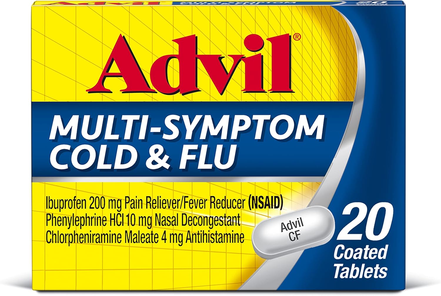 About this item One bottle of 20 coated tablets of Advil Multi Symptom Cold and Flu Medicine, Cold Medicine for Adults with Ibuprofen, Phenylephrine HCL and Chlorpheniramine Maleate Powerful Ibuprofen 200mg, chlorpheniramine maleate 4mg and phenylephrine HCL 10 mg tablets for multi-symptom relief Uniquely formulated to fight common cold and flu symptoms, providing nasal congestion, nasal swelling, sneezing, sinus pressure, headache, fever, body aches and runny nose relief Cold medicine for adults available in easy-to-take coated tablet form - the perfect addition to your college dorm room essentials For use by people 12 years of age and older Take one tablet every four hours while symptoms persist HSA and FSA eligible product See more product details,One bottle of 20 coated tablets of Advil Multi Symptom Cold and Flu Medicine, Cold Medicine for Adults with Ibuprofen, Phenylephrine HCL and Chlorpheniramine Maleate,Powerful Ibuprofen 200mg, chlorpheniramine maleate 4mg and phenylephrine HCL 10 mg tablets for multi-symptom relief,Uniquely formulated to fight common cold and flu symptoms, providing nasal congestion, nasal swelling, sneezing, sinus pressure, headache, fever, body aches and runny nose relief,Cold medicine for adults available in easy-to-take coated tablet form - the perfect addition to your college dorm room essentials,For use by people 12 years of age and older,Take one tablet every four hours while symptoms persist,HSA and FSA eligible product