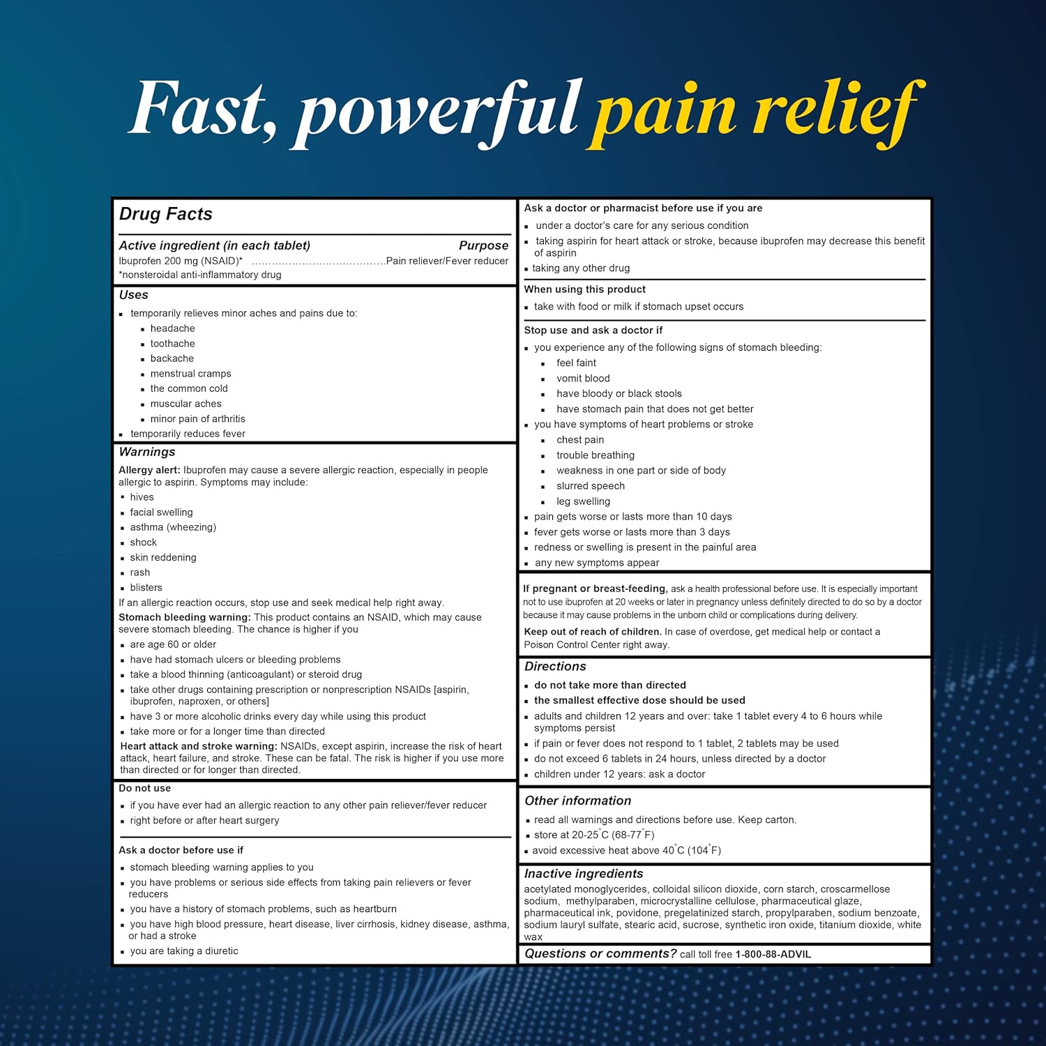 About this item The information below is per-pack only One bottle of 200 Advil Pain Reliever and Fever Reducer Coated Tablets that's Pain Relief Medicine with Ibuprofen 200mg for Joint Pain, Muscle Ache and Minor Arthritis Pain Relief, with easy open arthritis cap Advil ibuprofen pain reliever and fever reducer for adults provides longer lasting relief than Tylenol Extra Strength, and targets pain at the sight of inflammation New packaging features 20 percent less plastic to keep nearly 5,000 pounds of plastic out of landfills Minor arthritis pain reliever, joint pain medicine and back pain medicine that also provides menstrual pain relief, as well as relief of muscle aches or aches and pains from the common cold Coated Advil tablets are an easy to swallow pain medication for arthritis, while the Advil bottle includes an arthritis cap with a comfortable grip made for those with difficulty opening bottles Headache pain relief, period pain relief, back pain medication and fever medicine for adults and children 12 years and older Take these ibuprofen tablets as directed, taking one tablet every 4 to 6 hours while symptoms persist, or two tablets if pain or fever does not respond to one tablet HSA and FSA eligible product,The information below is per-pack only,One bottle of 200 Advil Pain Reliever and Fever Reducer Coated Tablets that's Pain Relief Medicine with Ibuprofen 200mg for Joint Pain, Muscle Ache and Minor Arthritis Pain Relief, with easy open arthritis cap,Advil ibuprofen pain reliever and fever reducer for adults provides longer lasting relief than Tylenol Extra Strength, and targets pain at the sight of inflammation,New packaging features 20 percent less plastic to keep nearly 5,000 pounds of plastic out of landfills,Minor arthritis pain reliever, joint pain medicine and back pain medicine that also provides menstrual pain relief, as well as relief of muscle aches or aches and pains from the common cold,Coated Advil tablets are an easy to swallow pain medication for arthritis, while the Advil bottle includes an arthritis cap with a comfortable grip made for those with difficulty opening bottles,Headache pain relief, period pain relief, back pain medication and fever medicine for adults and children 12 years and older,Take these ibuprofen tablets as directed, taking one tablet every 4 to 6 hours while symptoms persist, or two tablets if pain or fever does not respond to one tablet,HSA and FSA eligible product