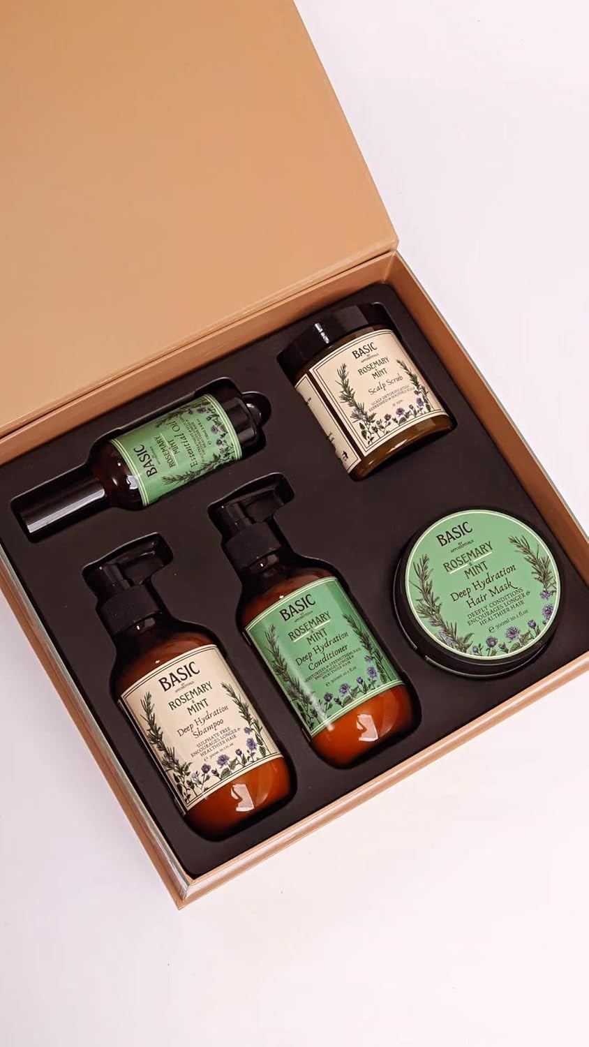 Product description Transform your daily hair care into a luxurious self-care ritual—crafted for modern lifestyles and real hair concerns. Infused with rosemary to support natural hair growth and mint to refresh the scalp, this complete 5-step set delivers salon-quality results from the comfort of home. What’s Inside: 1. Sulphate-Free Deep Cleansing Shampoo – Gently removes buildup without stripping essential moisture, making it ideal for sensitive scalps and daily use. 2. Hydrating Conditioner – Smooths and softens, leaving hair frizz-free, shiny, and manageable. 3. Scalp Detox Scrub – Exfoliates and revives the scalp, improving hair health at the root and helping reduce dandruff. 4. Intensive Repair Hair Mask – Deeply nourishes damaged strands, restores natural shine, and improves overall texture. 5. Strengthening Hair Oil & Serum – Locks in hydration, strengthens weak strands, and delivers long-lasting, healthy shine. Whether you’re managing hair fall, climate-related dryness, or the pressure of daily styling and covered hair, this set is designed to restore, strengthen, and nourish from root to tip. Thoughtfully made for all hair types, including treated or covered hair, Affosentials blends the power of science with the essence of self-love in one elegant, affordable set. Beautifully packaged and perfect for gifting or personal indulgence—because your hair deserves nothing less. Give your hair the care it’s been waiting for. Feel the difference—it’s time. Directions 1. Apply shampoo to wet hair, lather, and rinse thoroughly. 2. Apply conditioner to wet hair, leave for a few minutes, and rinse. 3. Use the scalp scrub by massaging into the scalp and rinse. 4. Apply the hair mask, leave for the recommended time, and rinse. 5. Apply the hair oil to damp or dry hair, focusing on the ends. P.when('A').execute(function(A) { A.on('a:expander:toggle_description:toggle:collapse', function(data) { window.scroll(0, data.expander.$expander[0].offsetTop-100); }); }); Safety Warning Do not ingest See more,?.Complete 5-Step Hair Repair System Transform dry, damaged, or thinning hair with our curated set: Shampoo, Conditioner, Hair Mask, Scalp Scrub, and Strengthening Oil,. ?Rosemary & Mint for Natural Hair Growth Infused with rosemary and mint – known to stimulate hair follicles, boost circulation, and promote visibly thicker, healthier hair,.Sulphate-Free Gentle on scalp and hair, free from harsh chemicals. Perfect for hijabis, clean beauty lovers, and anyone with sensitive skin,.For All Hair Types – Men & Women Whether you have curly, straight, frizzy, oily, or chemically treated hair – this set is your go-to solution for nourishment and shine,.Premium Gifting Idea Packed in elegant, luxurious packaging – ideal for birthdays, Eid, bridal hampers, or personal pampering