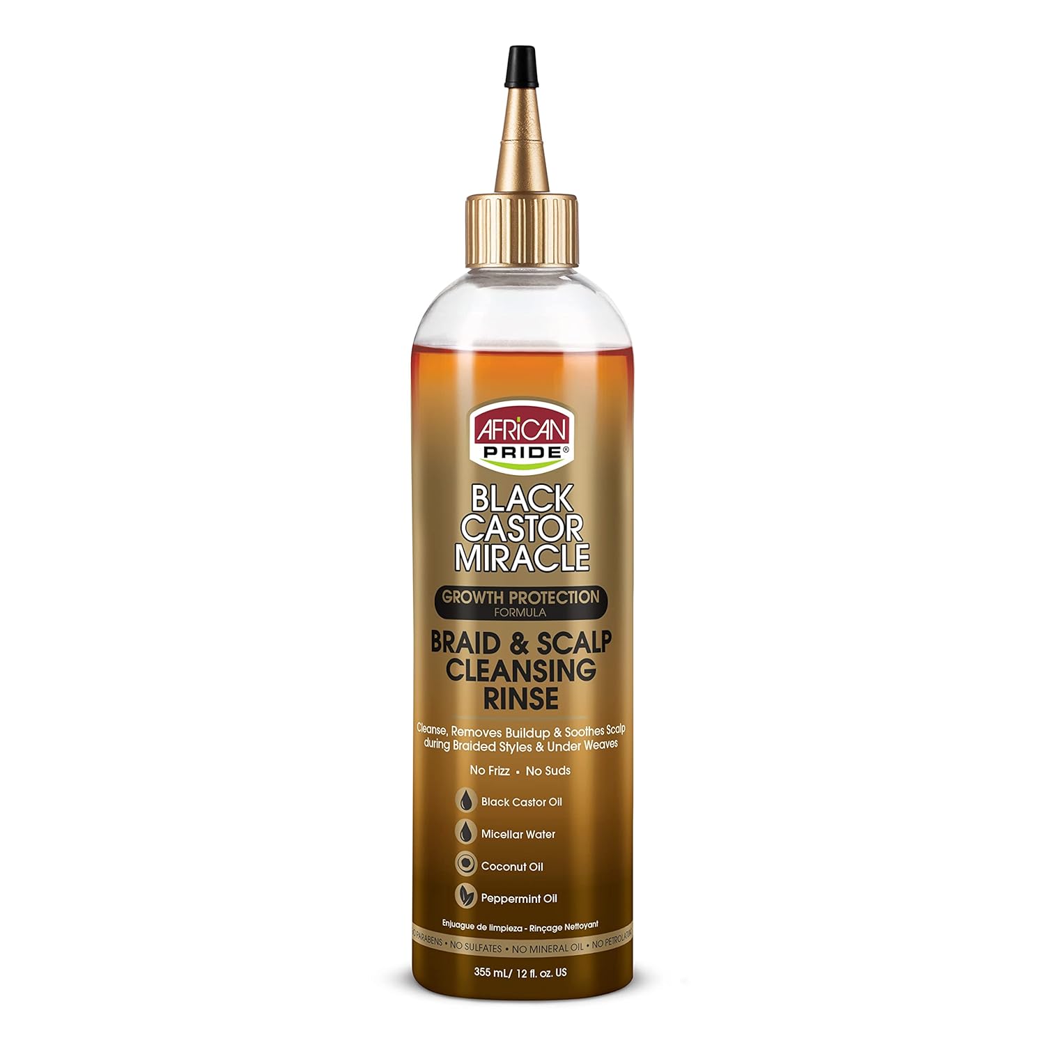 PROVEN HAIR CARE - Black Castor Miracle Braid & Scalp Cleansing Rinse gently detoxes & conditions hair, edges & scalp during braided styles & under weaves. This rinse also calms itching and reduces frizz leaving hair refreshed & styles lastingFEATURED INGREDIENTS - Black Castor Oil: Nourishes scalp & helps to promote hair growth; Micellar Water: Cleanses impurities without drying out hair & scalp; Coconut Oil: Conditions, hydrates & helps repair; Peppermint Oil: Soothes & refreshes scalpNATURALLY FORMULATED - The ingredients within African Pride products are free of harmful components, including parabens, mineral oil, sulfates, & petrolatum. By utilizing natural ingredients, we are able to provide high quality, safe productsHOW TO USE - Fix braids or lift weave to expose scalp. Point the nozzle & apply rinse following part-lines. Massage into scalp & hair. Rinse. Follow with African Pride Black Castor Miracle Sealing Oil or African Pride Olive Miracle Braid Sheen Spray