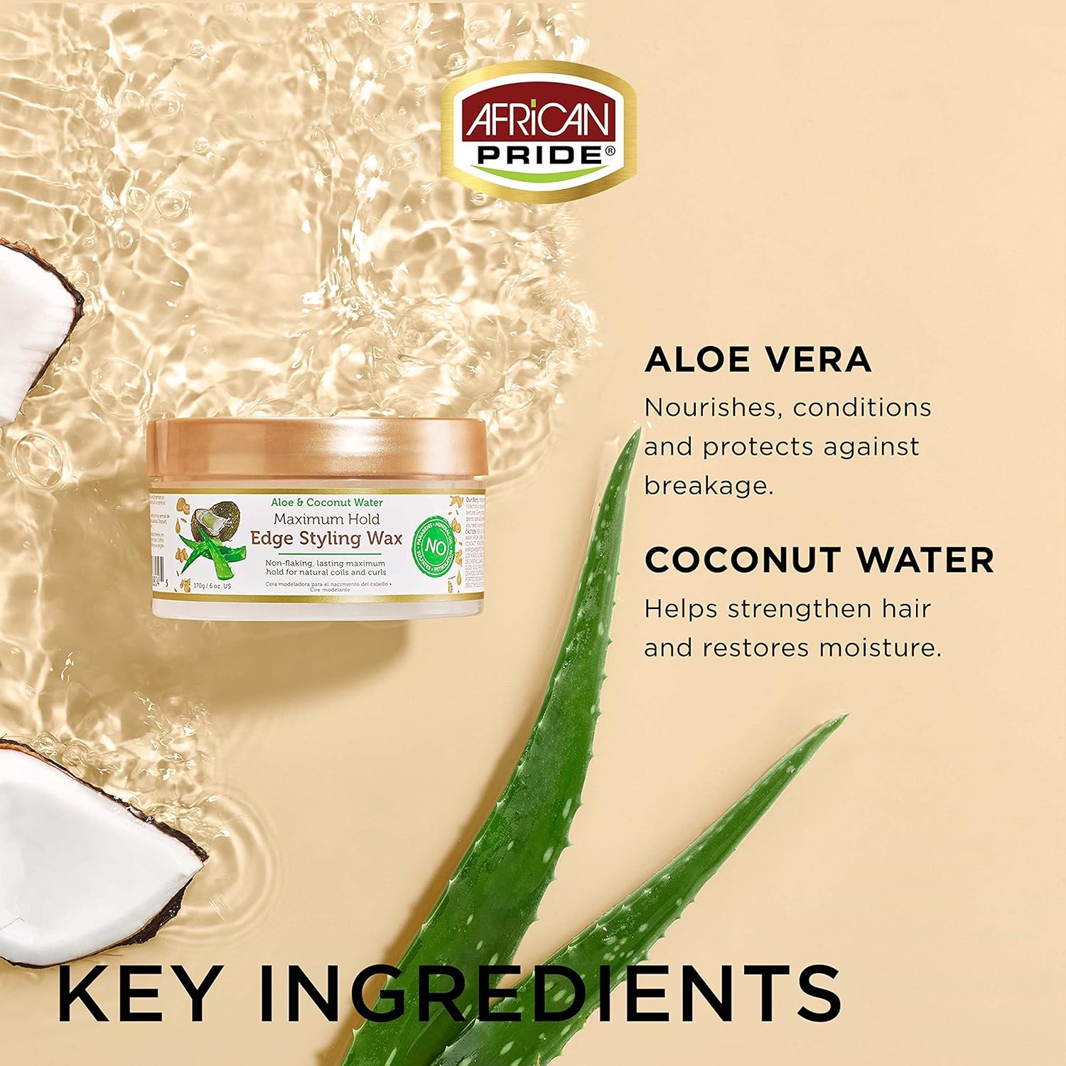 PROVEN HAIR CARE - This premium wax, with a blend of Aloe & Coconut, smooths and shapes hard to hold edges and hair without flaking; while nourishing & protecting against breakage, helping to leave edges healthy and tack freeFEATURED INGREDIENTS - Aloe Vera: Nourishes, conditions, and protects against breakage; Coconut Water: Helps strengthen hair and restores moistureNATURALLY FORMULATED - The ingredients within African Pride products are free of harmful components, including parabens, mineral oil, sulfates, & petrolatum. By utilizing natural ingredients, we are able to provide high quality, safe productsHOW TO USE - Apply to small sections of clean, wet hair. Smooth into hair in a downward motion. Follow immediately with a styling brush or comb to define each section. Scrunch coils & curls as needed
