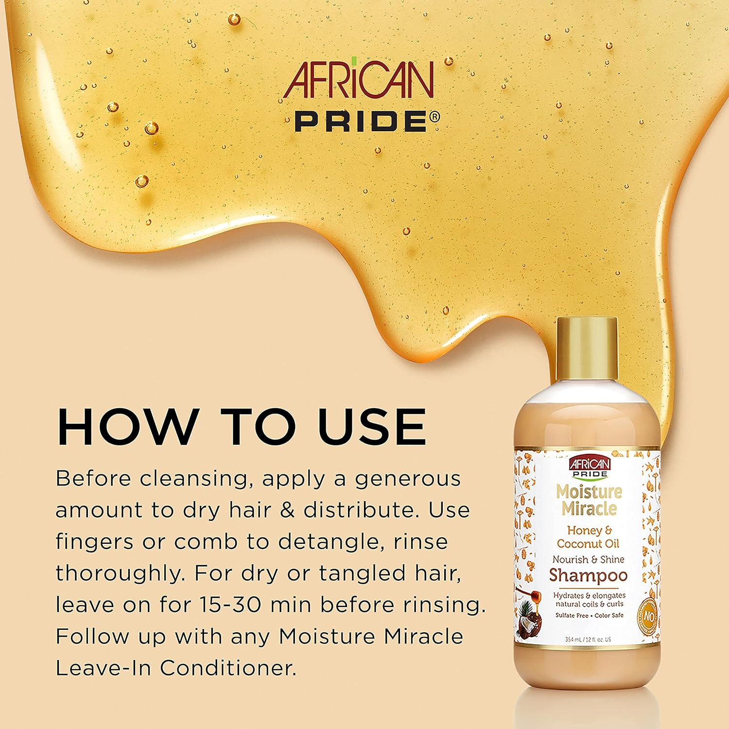 African Pride Moisture Miracle Aloe & Coconut Water Pre-Shampoo moisturizes, cleanses & detangles hair. African Pride Moisture Miracle Honey & Coconut Oil Shampoo gently cleanses natural hair to remove dirt & buildup without stripping out natural oilsPROVEN HAIR CARE - African Pride Moisture Miracle Aloe & Coconut Water Pre-Shampoo moisturizes, cleanses & detangles hair. African Pride Moisture Miracle Honey & Coconut Oil Shampoo gently cleanses natural hair to remove dirt & buildup without stripping out natural oilsFEATURED INGREDIENTS - Enriched with Aloe Vera: Nourishes, conditions, and protects against breakage; Coconut Water: Helps strengthen hair and restores moisture. Honey: Naturally retains moisture and adds shine; Coconut Oil: Deeply conditions, hydrates and helps repairNATURALLY FORMULATED - The ingredients within African Pride products are free of harmful components, including parabens, mineral oil, sulfates, & petrolatum. By utilizing natural ingredients, we are able to provide high quality, safe productsHOW TO USE - Before cleansing, apply a generous amount of Pre Shampoo to dry hair & distribute. Use fingers or comb to detangle, rinse thoroughly. For dry or tangled hair, leave on for 15-30 min before rinsing. Apply a generous amount of Shampoo to wet hair, massage into lather. Rinse thoroughly and repeat