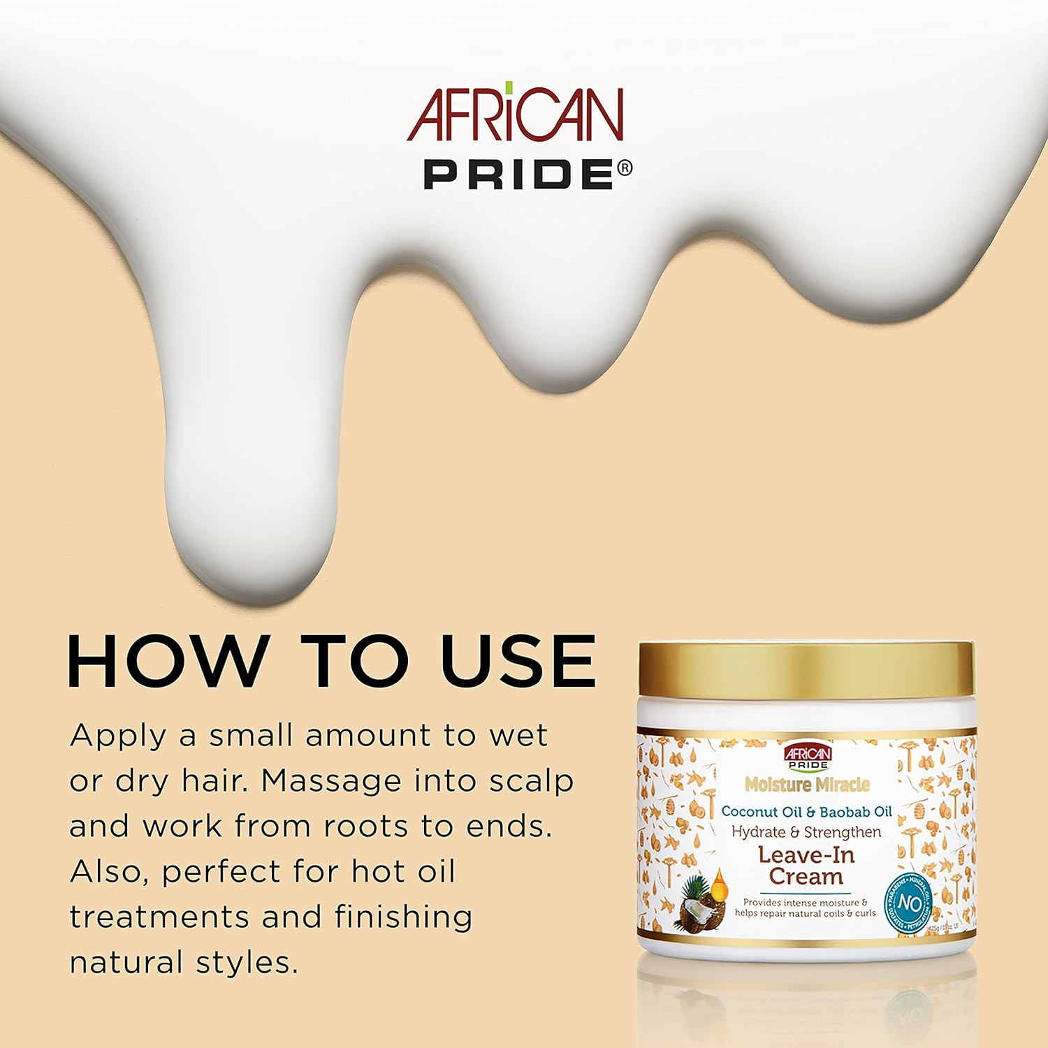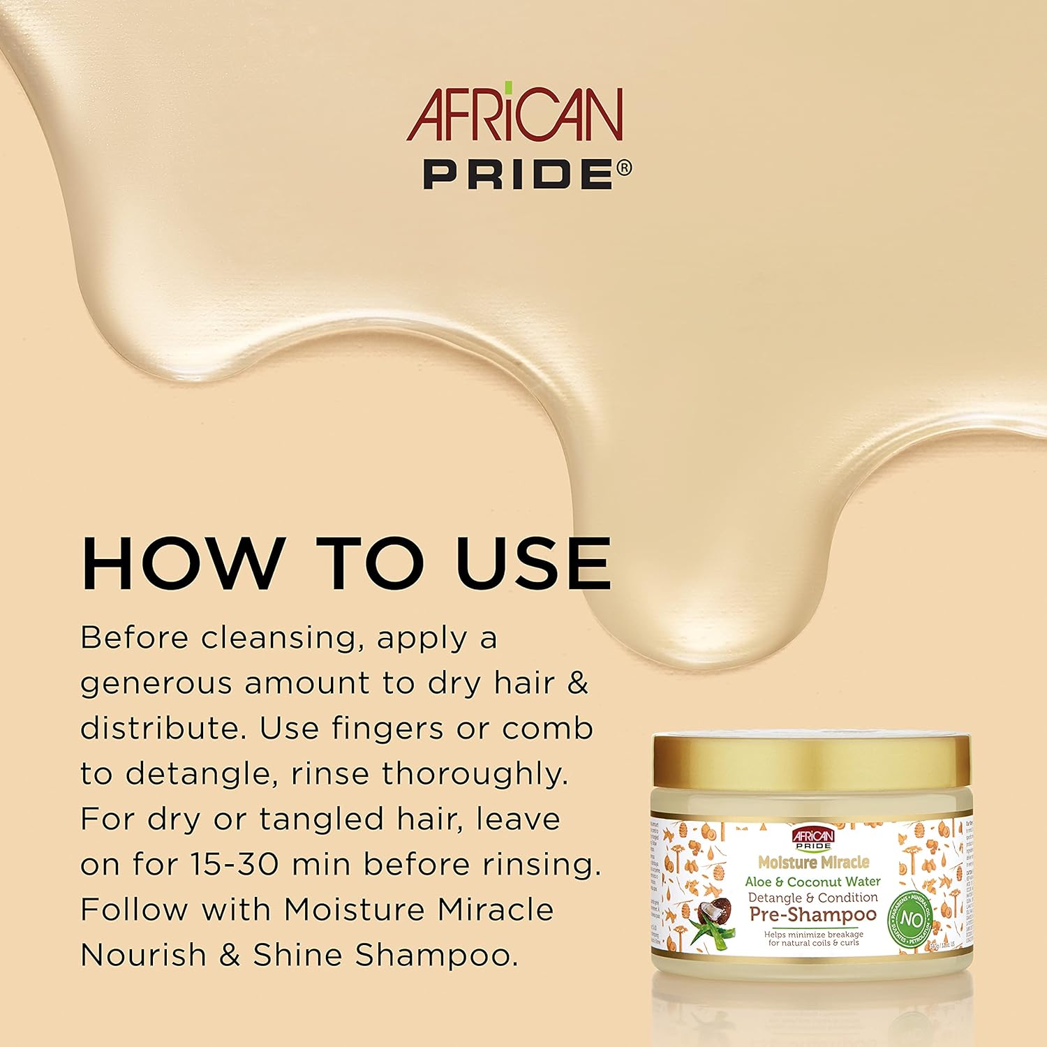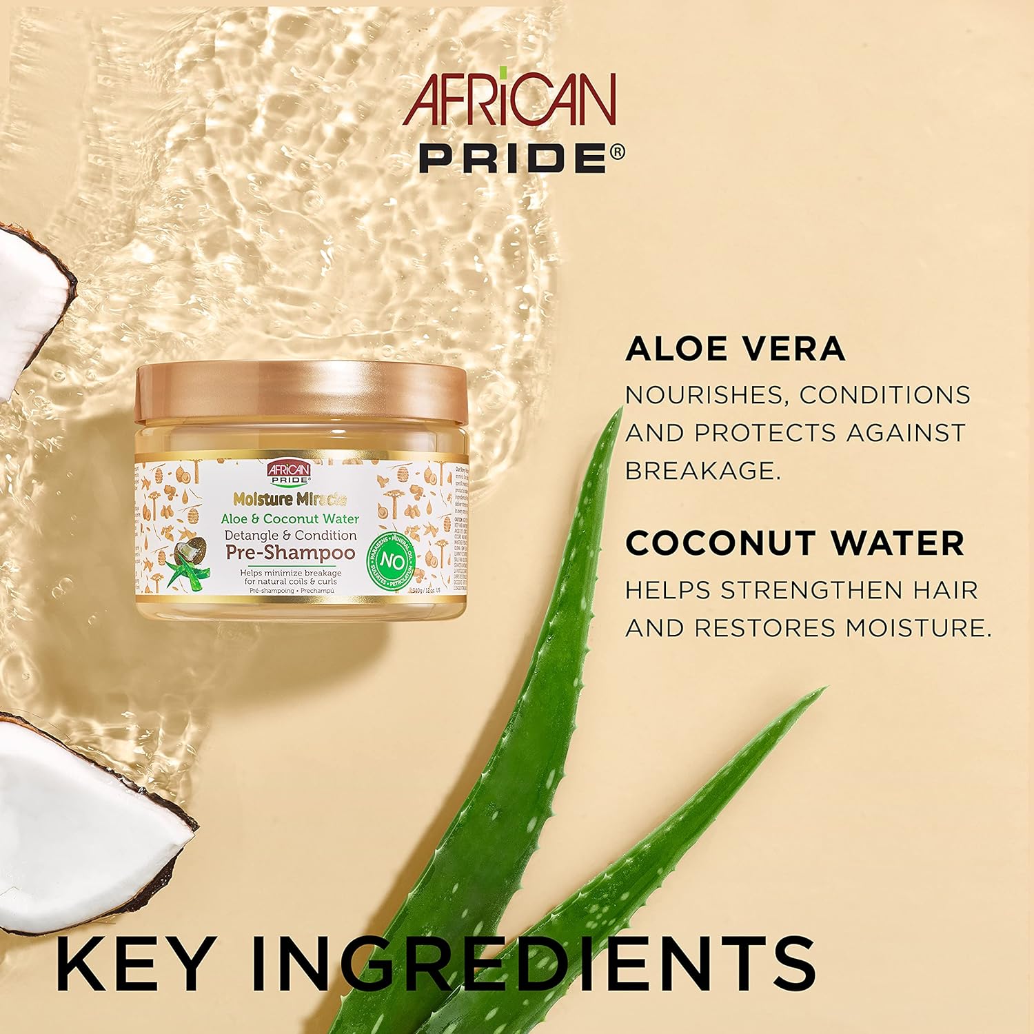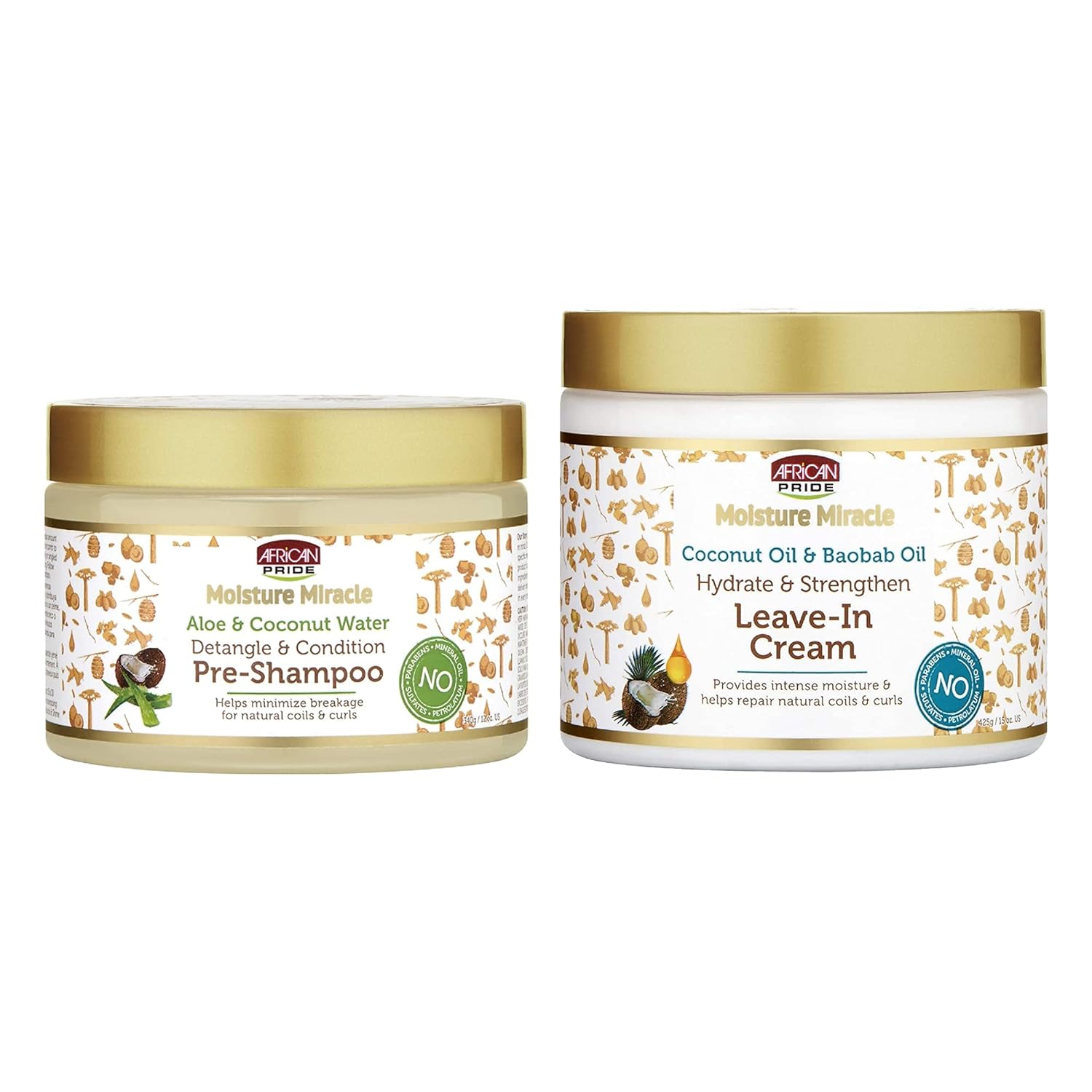 African Pride Moisture Miracle Aloe & Coconut Water Pre-Shampoo moisturizes, cleanses & detangles hair. African Pride Moisture Miracle Coconut Oil & Baobab Oil Leave-In Cream moisturizes hair & adds lasting hydration while protecting against breakage; leaving hair manageable & strong