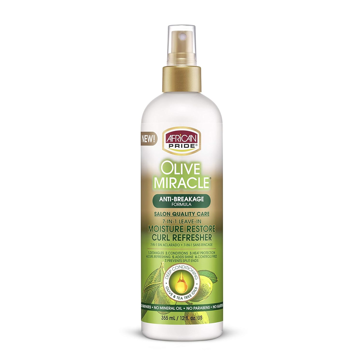PROVEN HAIR CARE - African Pride Natural Salon Care Moisture Restore Curl Refresher is a 7-IN-1 formula that detangles, conditions, protects against heat, refreshes curls, adds shine, controls frizz and prevents split ends. Olive and Tea Tree Oils help to provide anti-breakage nourishment for healthy looking hair and professional looking shine; Great hydration for natural hair; Moisturizes to help repair dry, damaged hair; Perfect for blow drying, maintaining short hair stylesNATURALLY FORMULATED - The ingredients within African Pride products are free of harmful components, including parabens, mineral oil, sulfates, & petrolatum. By utilizing natural ingredients, we are able to provide high quality, safe productsHOW TO USE - Spray liberally through damp hair and use a wide tooth comb to distribute evenly from roots to ends. Style as desired. May also be used on dry hair to freshen and renew hairstyleABOUT THE BRAND - Protect your hair and give your coils what they crave. New Olive Miracle Natural Salon Care. Formulated for maximum length retention, with olive and tea tree oils to deep condition hair and scalp. Set your looks with non-flaking hold, moisture restored, and weightless protection. New Olive Miracle Natural Salon Care by African Pride