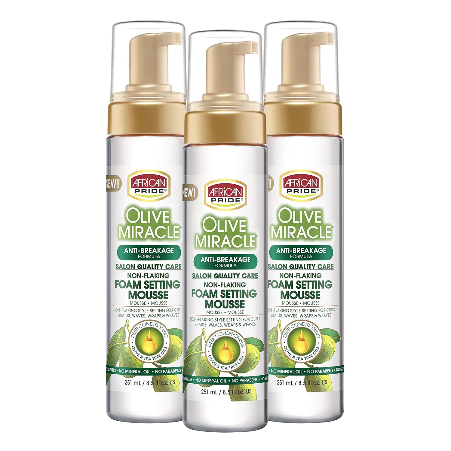 African Pride Olive Miracle Non-Flaking Foam Setting Hair Mousse (3 Pack), Long-Lasting Frizz & Shine Control for Curls, Braids, Weaves, Wigs, Waves & Wraps, 8.5 oz
