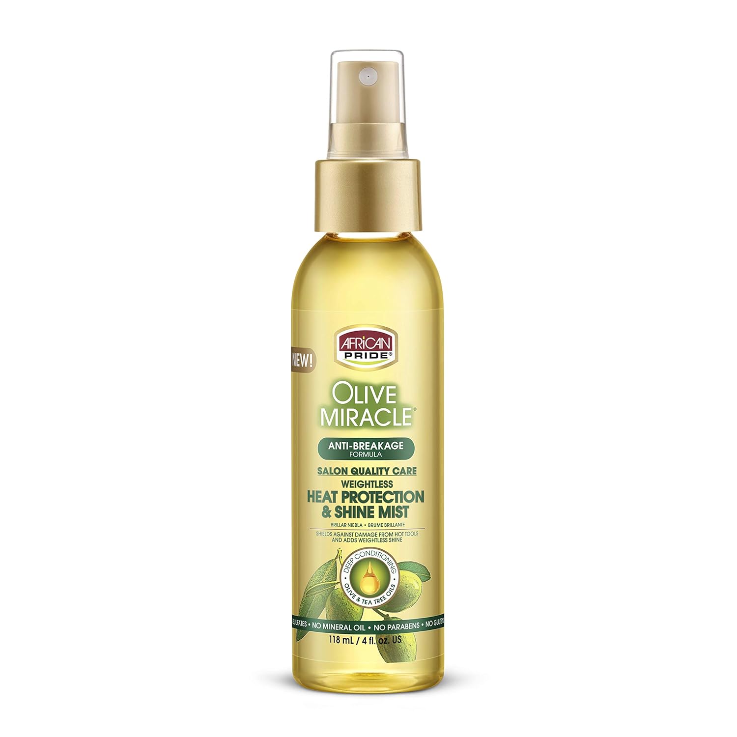PROVEN HAIR CARE - African Pride Olive Miracle Natural Salon Care Heat Protection & Shine Mist is a weightless formula that shields against heat, humidity and frizz. Olive and Tea Tree Oils help to leave hair nourished with a healthy-looking shine; Perfect for straight styling with blow dryers, flat irons, curl wands and other silkening tools; Great as a finisher for weightless, frizz-free shineFEATURED INGREDIENTS - Olive Oil: Seals in moisture, helps prevent breakage; Tree Oil: Helps protect and condition scalp & hairNATURALLY FORMULATED - The ingredients within African Pride products are free of harmful components, including parabens, mineral oil, sulfates, & petrolatum. By utilizing natural ingredients, we are able to provide high quality, safe productsHOW TO USE - On damp hair: spray on lightly before blow drying or air drying. On dry hair: mist hair in targeted sections throughout the hair before using a flat iron or curling iron. After styling, mist lightly for a healthy-looking frizz-free finish