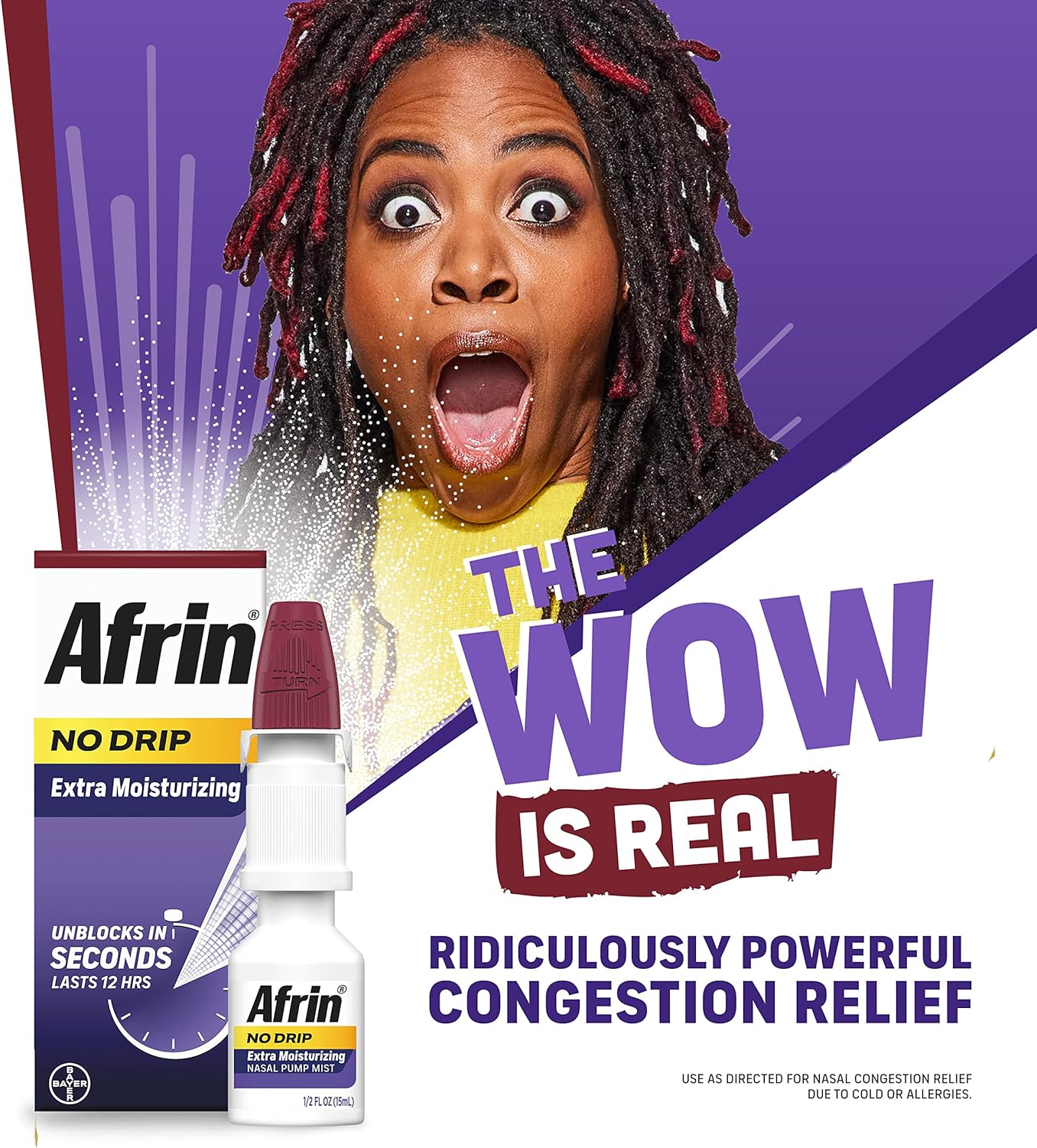 About this item Afrin No Drip Extra Moisturizing is a nasal pump mist designed to relieve nasal congestion for up to 12 hours Nasal decongestant pump mist works instantly to provide nasal and sinus congestion relief caused by allergies or other nasal irritants. Medicated no drip nasal spray doesnât drip from your nose or down your throat 12 hour medicated moisturizing nasal spray soothes dry nasal passages Use Afrin nasal mist as directed, spraying two or three times into each nostril for no more than three days See more product details,Afrin No Drip Extra Moisturizing is a nasal pump mist designed to relieve nasal congestion for up to 12 hours,Nasal decongestant pump mist works instantly to provide nasal and sinus congestion relief caused by allergies or other nasal irritants,Medicated no drip nasal spray doesnât drip from your nose or down your throat,12 hour medicated moisturizing nasal spray soothes dry nasal passages,Use Afrin nasal mist as directed, spraying two or three times into each nostril for no more than three days