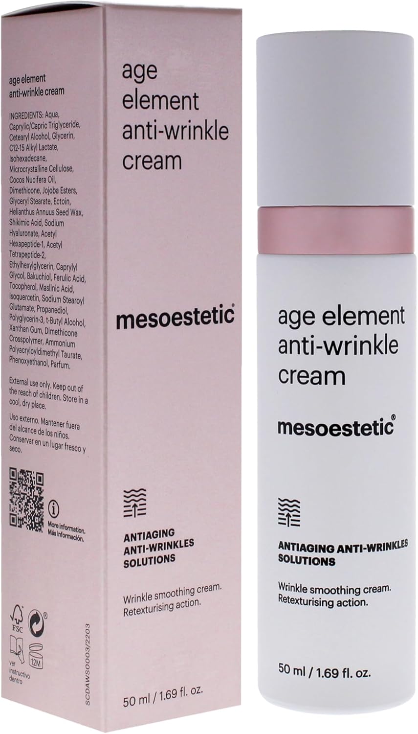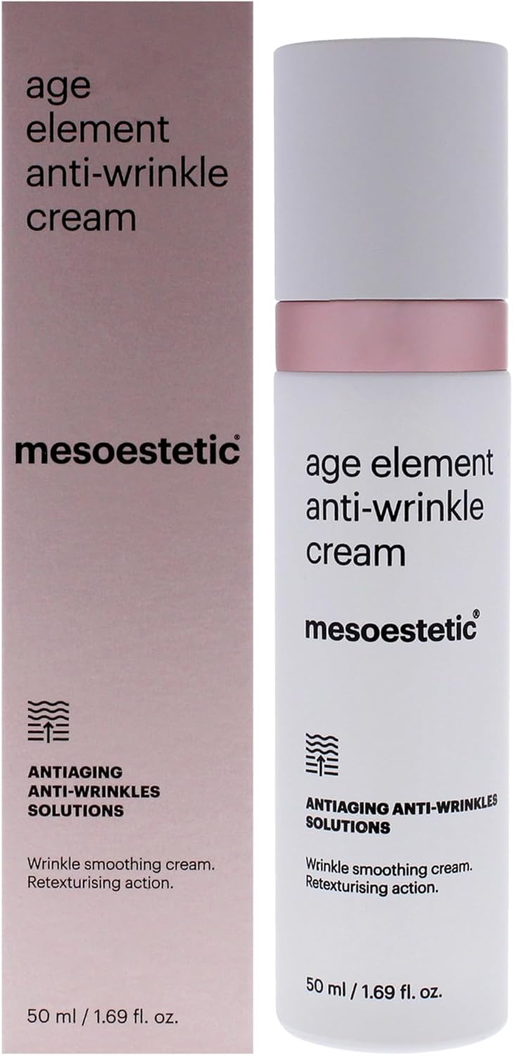 About this item Experience the rejuvenating benefits of Age Element Anti Wrinkle Cream by Mesoestetic. This 1.69 oz cream is designed to combat the signs of aging, providing intense hydration and nourishment to the skin. Suitable for all skin types, it promotes a youthful appearance with regular use. Formulated with advanced ingredients, this cream works to improve skin texture and elasticity, reducing the visibility of fine lines and wrinkles. Its lightweight texture absorbs quickly, ensuring your skin feels refreshed and revitalized. Ideal for those seeking effective anti-aging solutions. Gift the gift of youthful skin with this luxurious anti-wrinkle cream. Its elegant packaging reflects the quality and effectiveness of the product, making it a thoughtful present for birthdays or special occasions. Discover the transformative effects of Age Element and embrace a more youthful complexion. › See more product details,Experience the rejuvenating benefits of Age Element Anti Wrinkle Cream by Mesoestetic. This 1.69 oz cream is designed to combat the signs of aging, providing intense hydration and nourishment to the skin. Suitable for all skin types, it promotes a youthful appearance with regular use,Formulated with advanced ingredients, this cream works to improve skin texture and elasticity, reducing the visibility of fine lines and wrinkles. Its lightweight texture absorbs quickly, ensuring your skin feels refreshed and revitalized. Ideal for those seeking effective anti-aging solutions,Gift the gift of youthful skin with this luxurious anti-wrinkle cream. Its elegant packaging reflects the quality and effectiveness of the product, making it a thoughtful present for birthdays or special occasions. Discover the transformative effects of Age Element and embrace a more youthful complexion