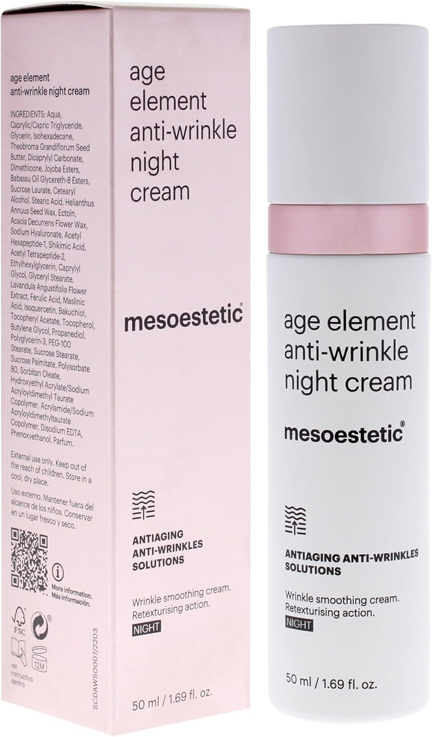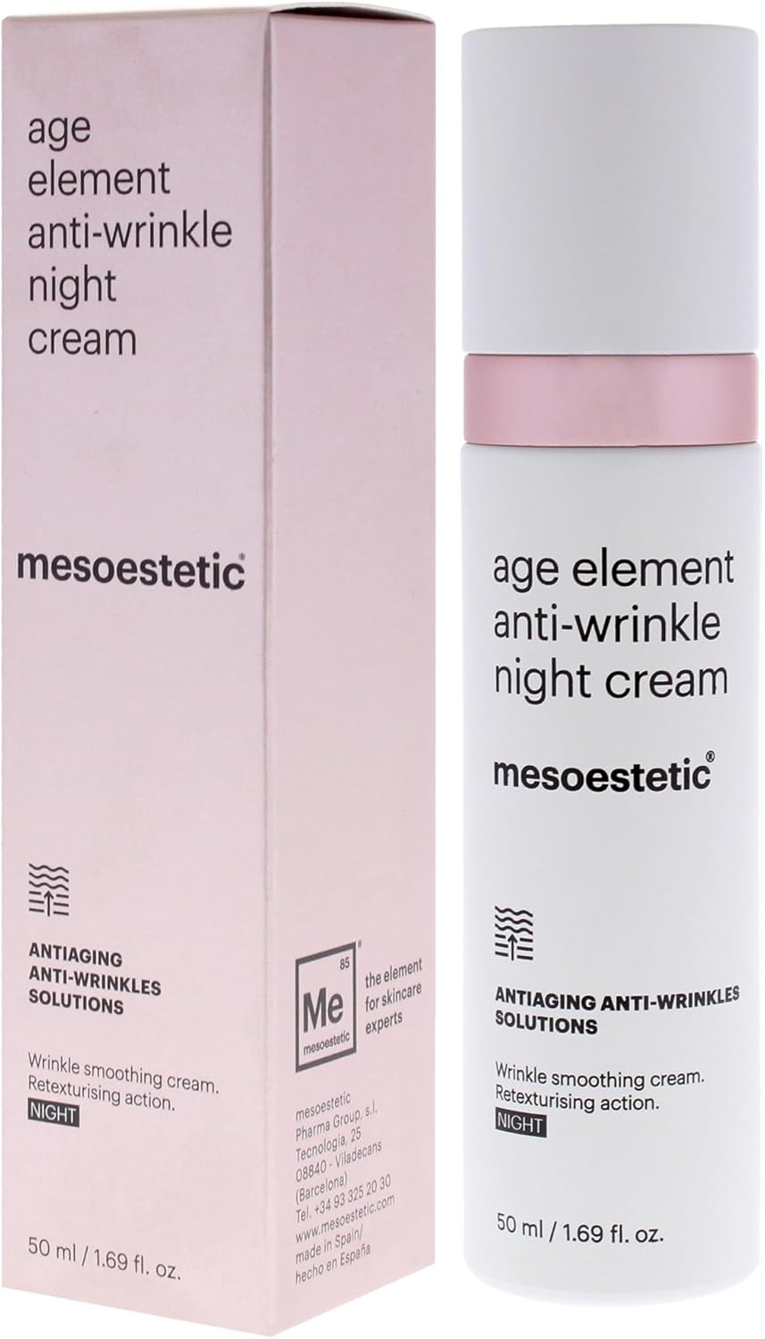 About this item Discover the power of overnight rejuvenation with Age Element Anti Wrinkle Night Cream by Mesoestetic. This 1.69 oz cream is specifically formulated to nourish and repair skin while you sleep, helping to restore its youthful glow and texture. Suitable for all skin types, it provides intensive care. Infused with potent active ingredients, this night cream works to reduce the appearance of fine lines and wrinkles while improving skin elasticity. Its rich formula absorbs quickly, ensuring you wake up to refreshed and revitalized skin, perfect for a nightly skincare routine. Gift this luxurious night cream to loved ones who appreciate effective skincare solutions. The elegant packaging and high-quality formulation reflect the commitment to excellence associated with Mesoestetic. Experience the benefits of nighttime hydration and rejuvenation for a more youthful, glowing complexion. › See more product details,Discover the power of overnight rejuvenation with Age Element Anti Wrinkle Night Cream by Mesoestetic. This 1.69 oz cream is specifically formulated to nourish and repair skin while you sleep, helping to restore its youthful glow and texture. Suitable for all skin types, it provides intensive care,Infused with potent active ingredients, this night cream works to reduce the appearance of fine lines and wrinkles while improving skin elasticity. Its rich formula absorbs quickly, ensuring you wake up to refreshed and revitalized skin, perfect for a nightly skincare routine,Gift this luxurious night cream to loved ones who appreciate effective skincare solutions. The elegant packaging and high-quality formulation reflect the commitment to excellence associated with Mesoestetic. Experience the benefits of nighttime hydration and rejuvenation for a more youthful, glowing complexion