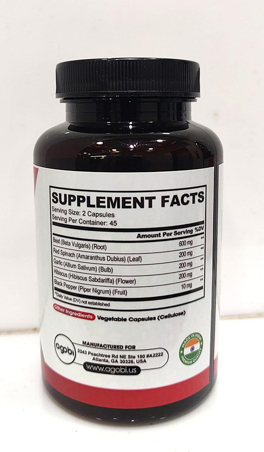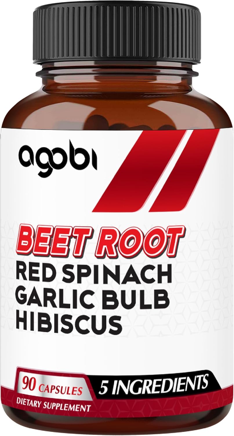 About this item Beet Root Extract Complex with 5 premium ingredients: Beet Root Powder, Red Spinach, Organic Garlic Bulb, Hibiscus & Black Pepper. Rich in fiber - Keep the body healthy, the mind clear, the heart whole, and the purse full. Extra Strength Booster with High Absorption Agobi Beet Root Supplements is scientifically developed for immune system, energy production, circulation & digestive health. Keep the body balance with excellent benefits. Two beet root capsules daily with water & meal; Convenient 45-day supply with 1 pack 90-capsule bottle; Bring your health to the next level - Start today! Tested! All Agobi Bottles are made by cGMP, ISO, and FDA-registered manufacturer. Gluten-free, non-GMO, plant-based, keto-friendly, vegan. Quality assured by USA lab. Maintain a healthy balance by incorporating exercise, and our premium supplements into your lifestyle for a vibrant and fulfilling life. Choosing Agobi - Choosing to make a difference! See more product details, Beet Root Extract Complex with 5 premium ingredients: Beet Root Powder, Red Spinach, Organic Garlic Bulb, Hibiscus & Black Pepper. Rich in fiber - Keep the body healthy, the mind clear, the heart whole, and the purse full, Extra Strength Booster with High Absorption Agobi Beet Root Supplements is scientifically developed for immune system, energy production, circulation & digestive health. Keep the body balance with excellent benefits, Two beet root capsules daily with water & meal; Convenient 45-day supply with 1 pack 90-capsule bottle; Bring your health to the next level - Start today!, Tested! All Agobi Bottles are made by cGMP, ISO, and FDA-registered manufacturer. Gluten-free, non-GMO, plant-based, keto-friendly, vegan. Quality assured by USA lab, Maintain a healthy balance by incorporating exercise, and our premium supplements into your lifestyle for a vibrant and fulfilling life. Choosing Agobi - Choosing to make a difference!