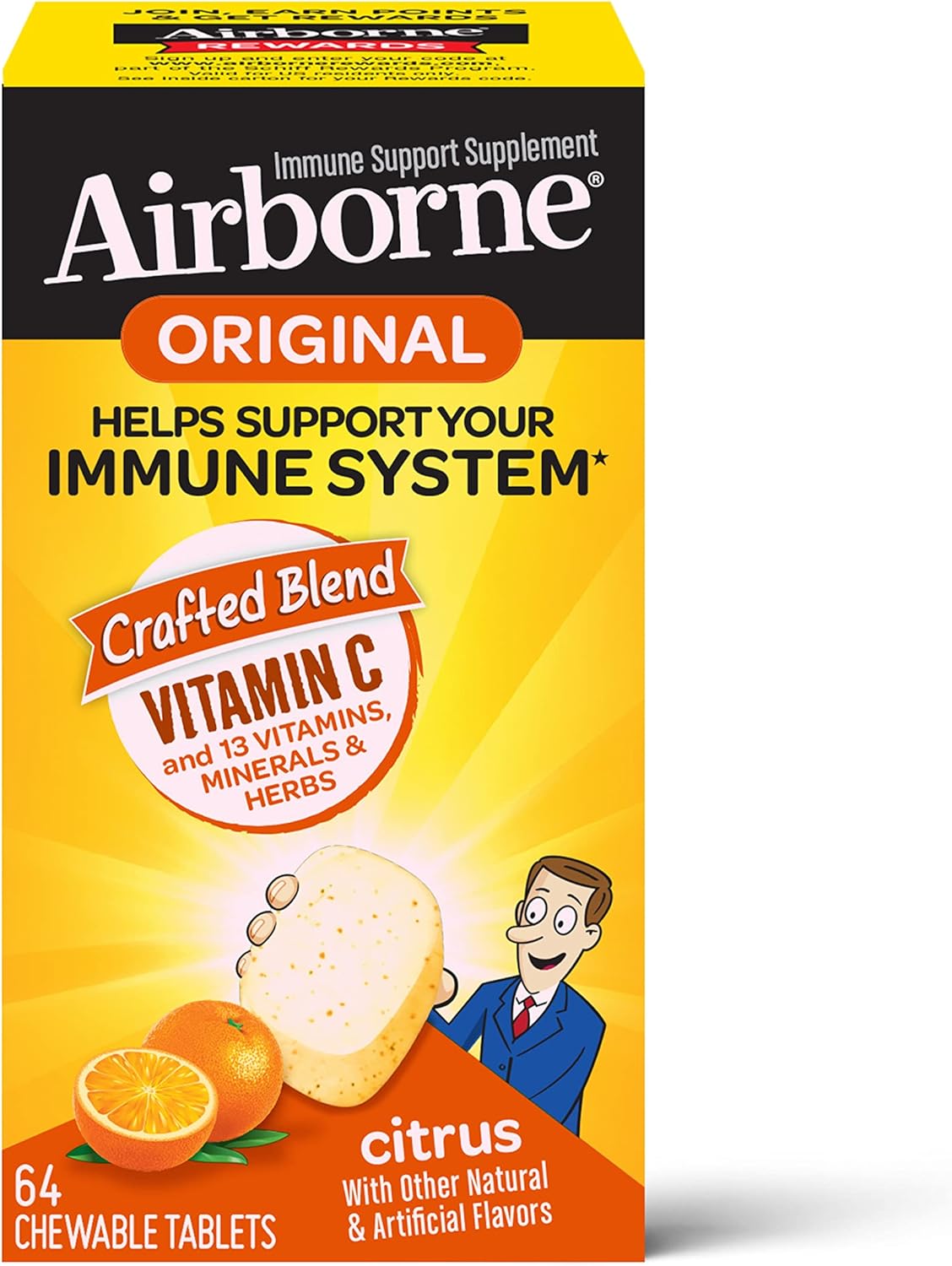 About this item WHAT IS IT: This is a unique Vitamin, Mineral & Herbal blend that helps support your immune system.* This GLUTEN FREE supplement is high in antioxidants (Vitamins A C E) and contains Zinc, Selenium, Manganese & Magnesium. WHY TO TAKE AIRBORNE: Airborne is the #1 Immune Support Gummy, Effervescent & Chewable Brand. These tablets are easy & convenient for you or your family to take at home or on the go. Vitamin C is among the most important antioxidants in immune health.* DEVELOPED BY A SCHOOL TEACHER: The original Airborne recipe was cooked up by an ingenious teacher about 20 years ago. Why Because throughout the school year, she wanted to provide her immune system with proper support. HOW MUCH SHOULD I TAKE: Adults & children 12 years of age and older: Chew (4) tablets a day. One serving of (4) chewable tablets provides 1000mg of VITAMIN C! COMMONLY SEARCHED TOPICS: airborn airborne airbourn airbourne air born adults men women kids children chew chewables minerals herbs vitamins a c e zinc magnesium manganese selenium echinacea ginger emergency antioxidants immune system support gluten free See more product details,WHAT IS IT: This is a unique Vitamin, Mineral & Herbal blend that helps support your immune system.* This GLUTEN FREE supplement is high in antioxidants (Vitamins A C E) and contains Zinc, Selenium, Manganese & Magnesium,WHY TO TAKE AIRBORNE: Airborne is the #1 Immune Support Gummy, Effervescent & Chewable Brand. These tablets are easy & convenient for you or your family to take at home or on the go. Vitamin C is among the most important antioxidants in immune health,DEVELOPED BY A SCHOOL TEACHER: The original Airborne recipe was cooked up by an ingenious teacher about 20 years ago. Why Because throughout the school year, she wanted to provide her immune system with proper support,HOW MUCH SHOULD I TAKE: Adults & children 12 years of age and older: Chew (4) tablets a day. One serving of (4) chewable tablets provides 1000mg of VITAMIN C!,COMMONLY SEARCHED TOPICS: airborn airborne airbourn airbourne air born adults men women kids children chew chewables minerals herbs vitamins a c e zinc magnesium manganese selenium echinacea ginger emergency antioxidants immune system support gluten free