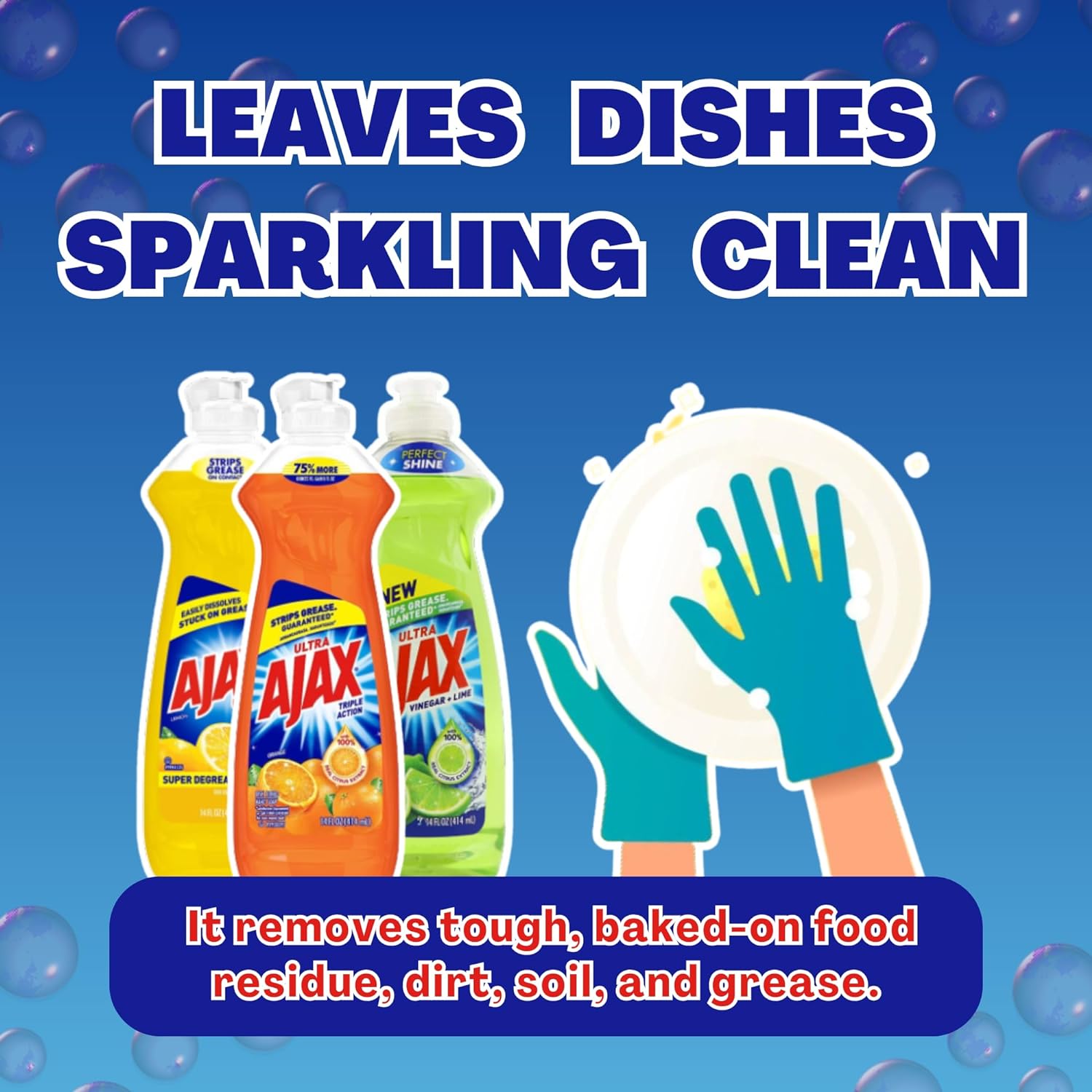 VARIETY OF SCENTS: Ajax Cleaner offers three captivating essences. The Lemon dish soap provides a lively aroma, tackling tough grease effectively. The Orange essence infuses a lovely fragrance and has powerful degreasing properties. The Lime essence delivers a refreshing and tangy scent, effortlessly cutting through grease10EFFECTIVE GREASE REMOVAL: Ajax dish soap liquid features a super degreasing formula that easily removes grease, oil, and food residue. Its powerful cleaning action ensures thorough results, leaving dishes, utensils, and cookware spotless and ready to use. It saves time and effort, even when dealing with the toughest dishes10CONCENTRATED FORMULA: Concentrated Formula has been designed to deliver exceptional cleaning power in every drop. Unlike traditional formulas, this concentrated version saves storage space and maximizes the yield of each bottle10CLEANING GLOVES: Our set includes specialized cleaning gloves designed for effective and safe handling. These gloves are easy to use, durable, and made from high-quality materials to protect your hands during cleaning tasks. They provide a reliable barrier and make cleaning activities more convenient10PACKAGED BY GAUDUM: We work with world-class brands to create creative bundles, variety packs, and gift boxes using their products, along with our branded complementary items. You will receive the Ultra Ajax Super Degreaser carefully packaged by us along with a pair of our Gaudum Cleaning Gloves