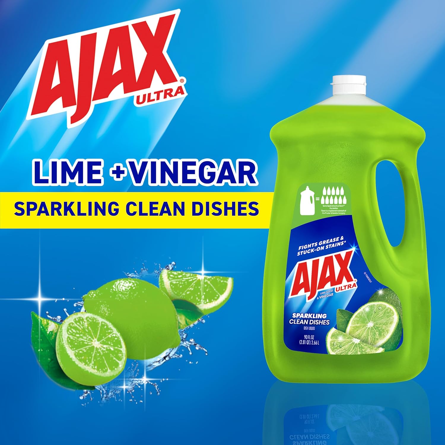 One 90 oz Bottle of Ajax Ultra Liquid Dish Soap Lime Scent and Vinegar, Sparkling Clean Dishes10This liquid dish soap brings a freshness to your kitchen with a burst of limes10This green dish soap provides a pleasant and powerful cleaning experience10Enhance your cleaning arsenal by harnessing the natural power of vinegar, a versatile cleaner that effortlessly tackles tough stains and grime10This dishwashing liquid is made with naturally inspired fragrances, zero parabens and no phosphates