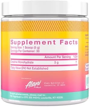 About this item SUPPORT ENDURANCE: Designed to support muscle strength, lean mass, growth, and endurance, our Creatine powder gives your body a boost β without building bulk. Each scoop contains 5g of pure creatine monohydrate and nothing else. No sugar, no gluten, and no artificial colors or flavors! PURE CREATINE POWDER: Alani Nu Creatine is just that β only creatine. No fillers or other unnecessary ingredients, because we care about what we put in your body as much as you do. Suggested Use: Mix 1 scoop (5g) of creatine in 8-12 oz of water or any flavored beverage. Take before or after working out. On rest days take before or after consuming a meal. MICRONIZED CREATINE: Still made from creatine monohydrate, Alani Nu Creatine has an ultra-fine texture to seamlessly mix with the beverage of your choice! Maximum potency supports muscle size, strength, and power with supreme absorbency micronized to get the most out of each dose. POST WORKOUT BFF: Creatine has shown to be beneficial by maintaining constant energy to our muscles during intense exercise β pushing you further with each rep, and providing lean mass, tone to help you tailor your gains. Creatine also helps restore muscles post workout, making this supplement your new gym BFF. ALANI NU MONOHYDRATE CREATINE: Beauty and wellness within - Alani Nu was Founded in 2018 by entrepreneur and influencer, Katy Hearn, Alani Nu is a health and wellness brand focused on providing low-calorie products with unique flavors. Check out everything else from Alani Nu and follow us through our brand store to stay up to date on all things Alani! See more product details,SUPPORT ENDURANCE: Designed to support muscle strength, lean mass, growth, and endurance, our Creatine powder gives your body a boost β without building bulk. Each scoop contains 5g of pure creatine monohydrate and nothing else. No sugar, no gluten, and no artificial colors or flavors!,PURE CREATINE POWDER: Alani Nu Creatine is just that β only creatine. No fillers or other unnecessary ingredients, because we care about what we put in your body as much as you do. Suggested Use: Mix 1 scoop (5g) of creatine in 8-12 oz of water or any flavored beverage. Take before or after working out. On rest days take before or after consuming a meal,MICRONIZED CREATINE: Still made from creatine monohydrate, Alani Nu Creatine has an ultra-fine texture to seamlessly mix with the beverage of your choice! Maximum potency supports muscle size, strength, and power with supreme absorbency micronized to get the most out of each dose,POST WORKOUT BFF: Creatine has shown to be beneficial by maintaining constant energy to our muscles during intense exercise β pushing you further with each rep, and providing lean mass, tone to help you tailor your gains. Creatine also helps restore muscles post workout, making this supplement your new gym BFF,ALANI NU MONOHYDRATE CREATINE: Beauty and wellness within - Alani Nu was Founded in 2018 by entrepreneur and influencer, Katy Hearn, Alani Nu is a health and wellness brand focused on providing low-calorie products with unique flavors. Check out everything else from Alani Nu and follow us through our brand store to stay up to date on all things Alani!