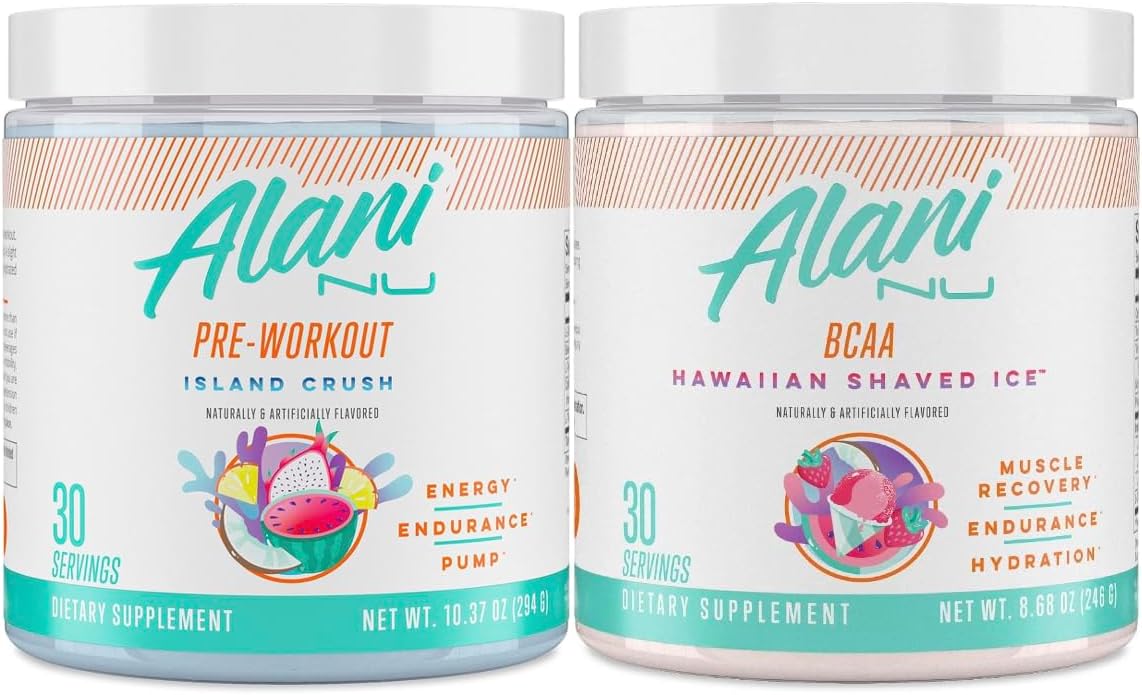 PRE WORKOUT & BCAA POST WORKOUT POWDER BUNDLE: Best of both! This bundle includes our 30 servings tub of AlaniNu Island Crush Pre Workout and our 30 servings tub of BCAA Hawaiian Shaved Ice Post Workout Powder