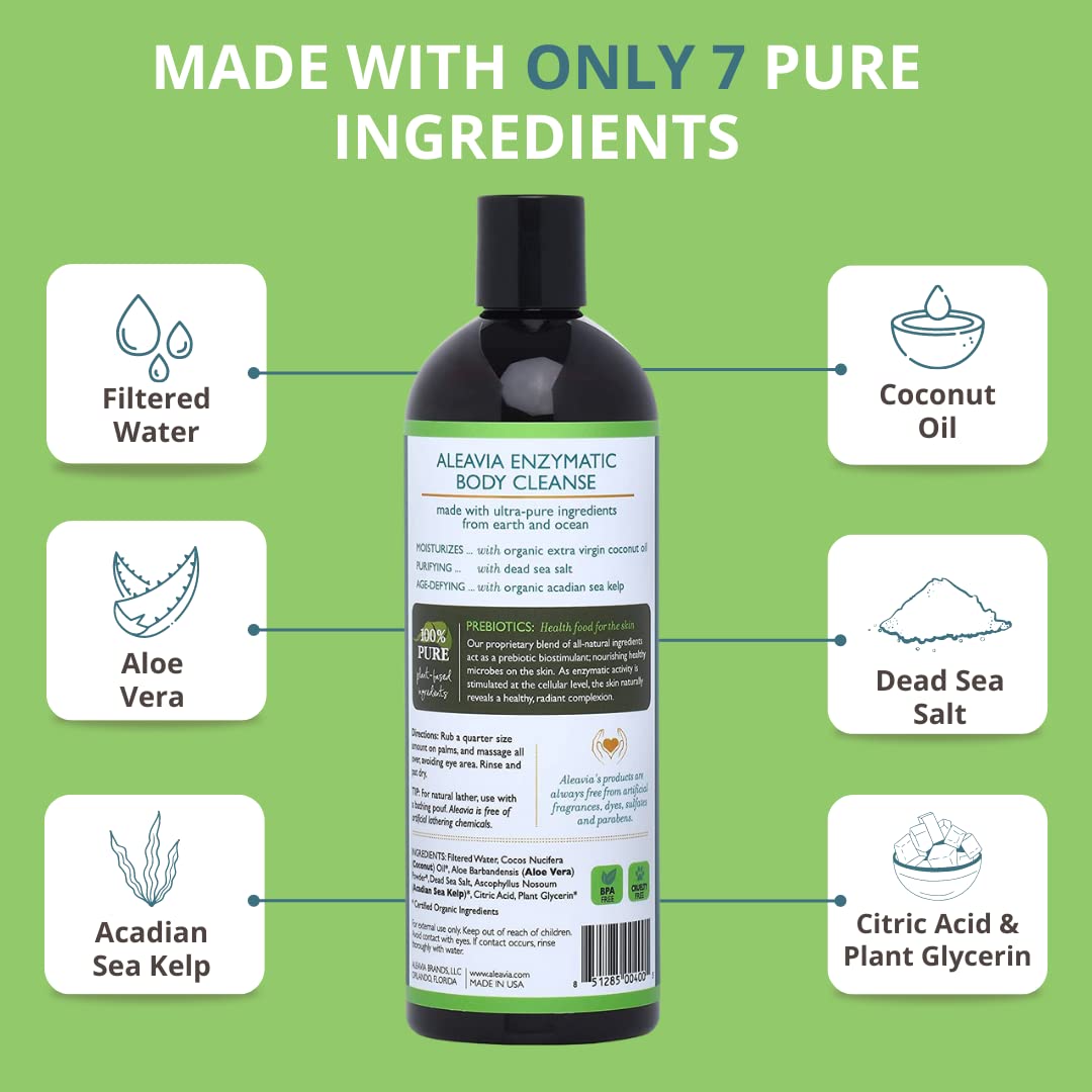 FRAGRANCE-FREE WITH NO DYES - Aleavia’s Enzymatic Body Cleanse is formulated with a unique combination of prebiotic nutrients that naturally stabilize the pH levels in your skin. Together with the seven simple, all natural, organic ingredients, Aleavia gently removes dirt, toxins, and excess oil on your skin’s surface, while feeding your healthy skin microbiome and preserving your skin’s natural protectants