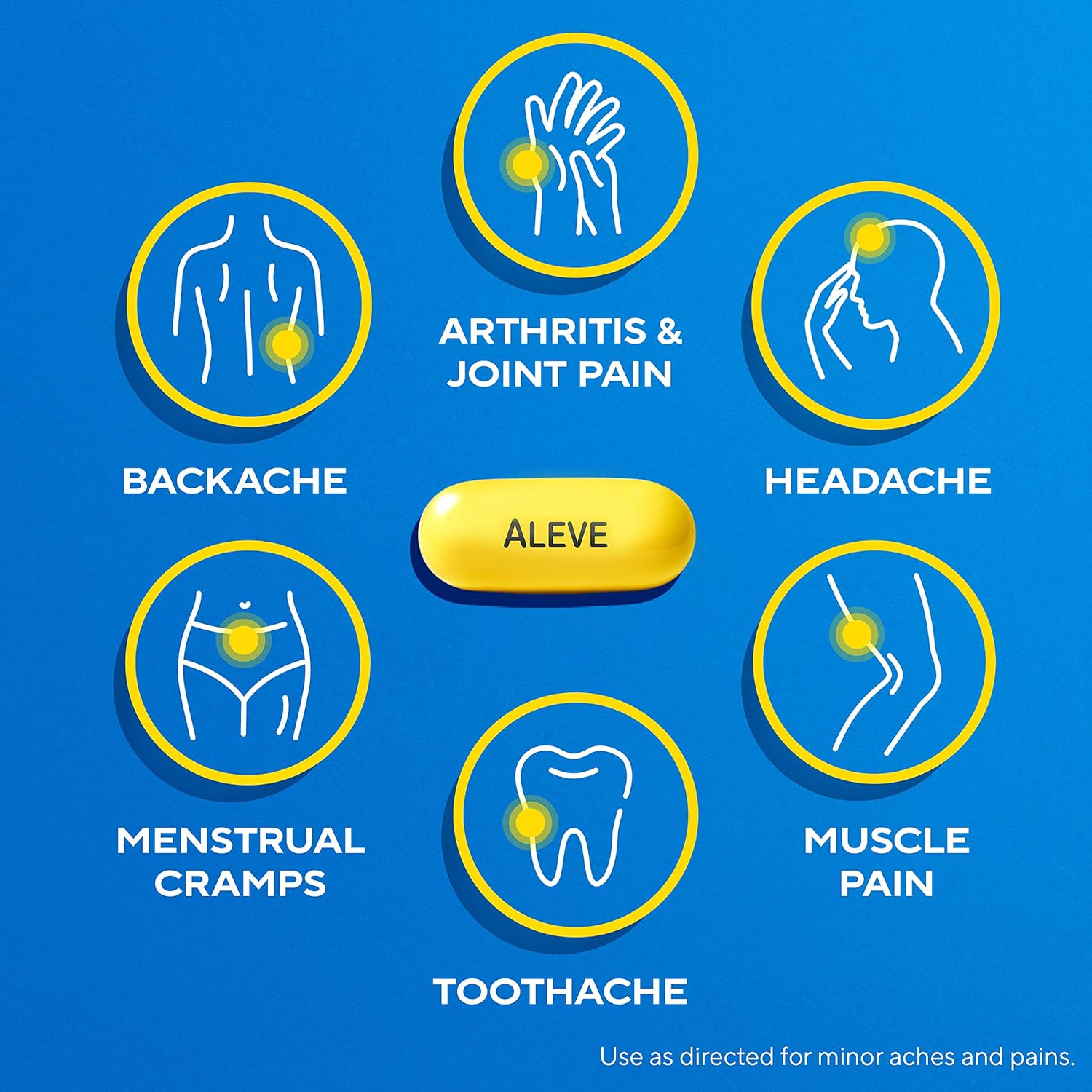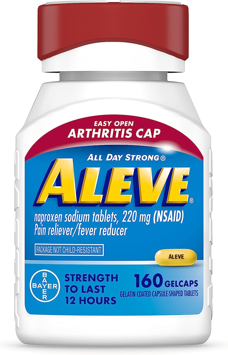 Up to 12-Hours of Uninterrupted Pain Relief: Aleve Pain Reliever & Fever Reducer Gelcaps provide long-lasting arthritis pain relief, as well as relief from muscular aches, backache, menstrual cramps, headache, toothache, and the common coldEasy Open Arthritis Cap: Specially designed arthritis bottle features an easy to open, cushionedcovered cap and contoured bottle for better control when your arthritis acts up. Package is not child-resistantFever Reducer: Temporarily reduces fever for adults and children aged 12 and upTargeted Pain Relief: naproxen sodium relieves minor pain from arthritisDoctor Recommended: #1 orthopedic doctor recommended OTC brand for minor arthritic painAleve Gelcaps are made with naproxen sodium to help you manage pain all day with just one pain relief pill. Each soft, liquid-filled naproxen sodium 220 mg gelcap has the strength to provide continuous pain relief for up to 12 hours and reduces fever. Aleve Gelcaps with Easy Open Arthritis Cap temporarily relieve minor aches and pains due to minor arthritis, as well as muscular aches, backache, menstrual cramps, headache, toothache, and the common cold. The Easy Open Arthritis Cap features an easy to open, cushioned-covered cap and contoured bottle for better control when your arthritis acts up. This pain medication comes in a small, easy to swallow gelcap. Pain happens. Aleve it Use as directed for minor aches and pains. Package is not child-resistant. *Among OTC Pain Reliever brands** **IQVIA, Arthritic Pain Relief Products, 12 months ending Q4 2022 ā Based on clinical study vs. Hydrocodone + Acetaminophen during the first 4 hours after initial dosing