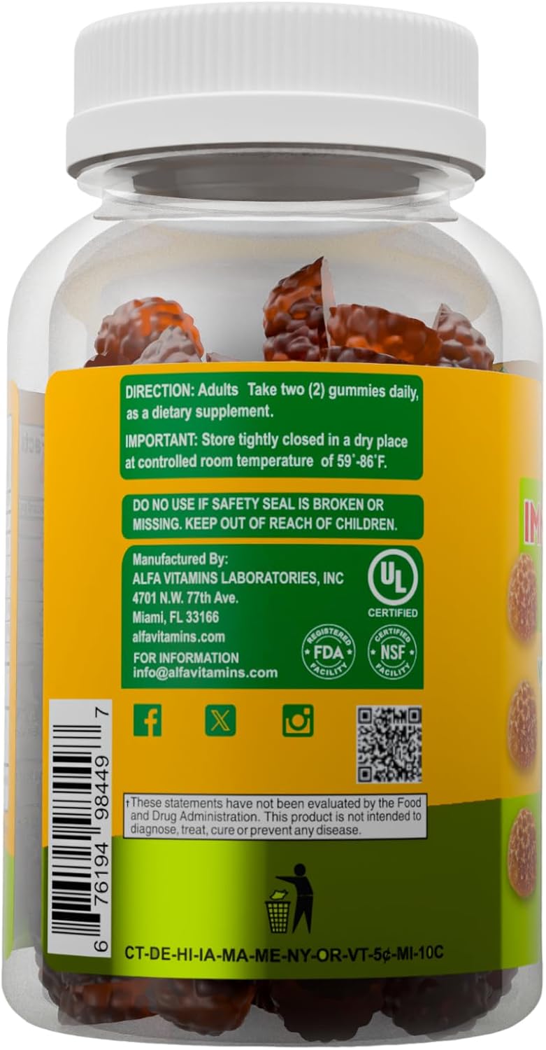 About this item 60 GUMMIES - Made with Natural Vitamin C 250mg Plus Zinc 10mg & Echinacea 100mg IMMUNE SUPPORT - Daily intake delivers all 3 ingredients to help boost your immune system and overall health. GOOD STUFF: Made with all-natural ingredients. Our gummies are vegan & vegetarian friendly, Non-GMO, Gluten-Free, Gelatin-Free (does not use animal products) & Dairy-Free. ALFA VITAMINS: Supplements are formulated in the USA in a safe GMP compliant facility. Our quality gummies are made using ONLY the best ingredients See more product details,60 GUMMIES - Made with Natural Vitamin C 250mg Plus Zinc 10mg & Echinacea 100mg,IMMUNE SUPPORT - Daily intake delivers all 3 ingredients to help boost your immune system and overall health,GOOD STUFF: Made with all-natural ingredients. Our gummies are vegan & vegetarian friendly, Non-GMO, Gluten-Free, Gelatin-Free (does not use animal products) & Dairy-Free,ALFA VITAMINS: Supplements are formulated in the USA in a safe GMP compliant facility. Our quality gummies are made using ONLY the best ingredients