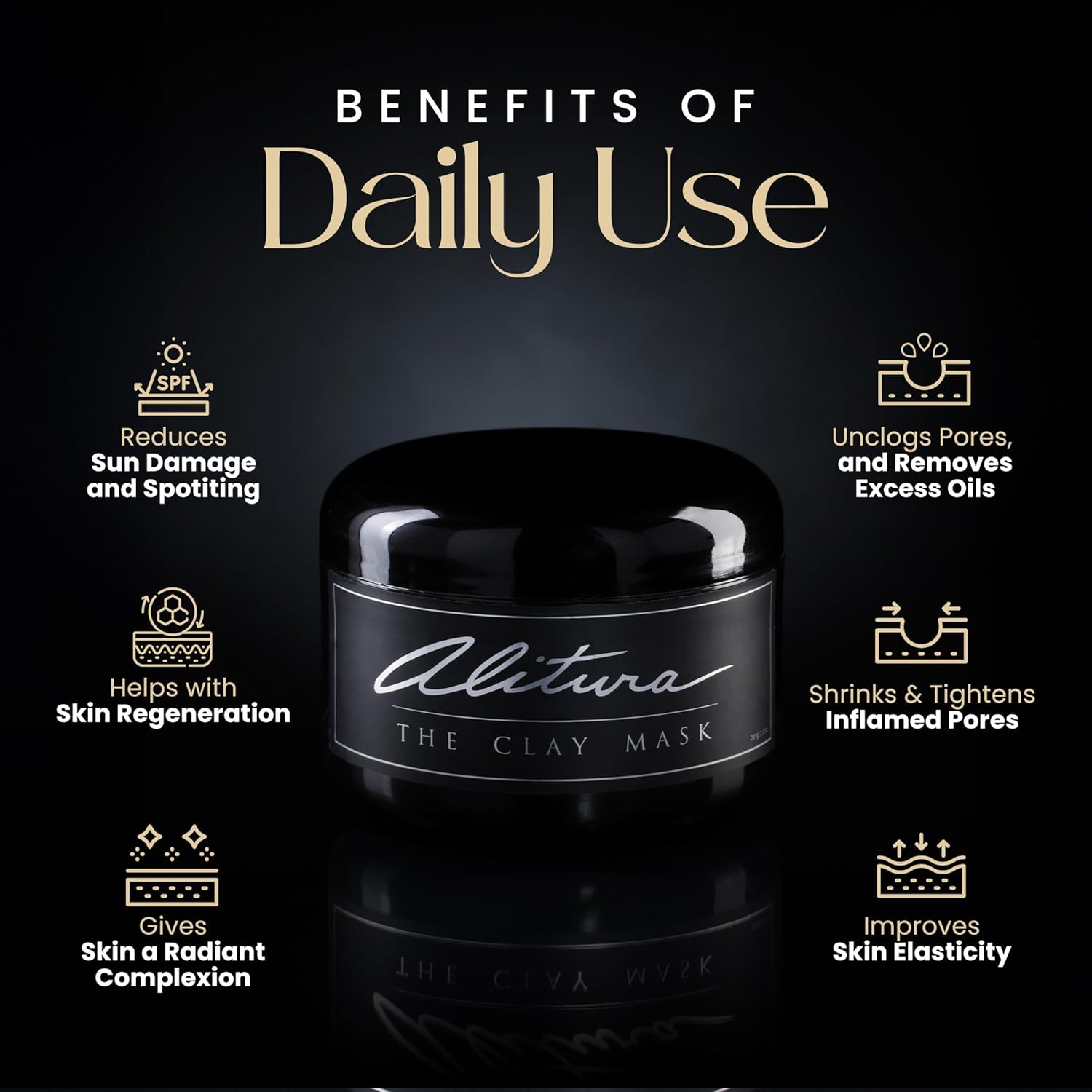 About this item Deep Detox Clay Mask for Face - Experience spa-quality skin care at home with the Alitura clay mask. Formulated to detoxify, exfoliate, and brighten, this facial mask draws out impurities, leaving skin visibly smoother, softer, and glowing. Anti-Aging Skincare Face Mask - Fight signs of aging with a powerful blend of Vitamin C, Freshwater Pearl Powder, and Four Mineral-dense Clays. This anti-aging clay mask helps reduce fine lines, improve elasticity, and diminish dark spots for a youthful, radiant complexion. Hydrating & Moisturizing Facial Treatment - Unlike harsh clay masks, Alitura’s mask hydrates while it detoxifies. Infused with natural moisturizing ingredients like Grass-fed Colostrum, this face mask nourishes deeply without over-drying sensitive or dry skin types. Acne Control & Pore Minimizer - Combat acne, blackheads, and clogged pores with this pore-cleansing mask. Gently exfoliates dead skin cells, reduces inflammation, and clears breakouts—ideal for acne-prone and combination skin types. How to Use for Best Results - In a non-metal bowl, mix 1–2 tablespoons of the clay mask with equal parts water until a smooth, creamy paste forms. Apply evenly to clean skin using fingertips or a brush. Leave on for 20–30 minutes or until fully dry. Rinse thoroughly with warm water, then finish with a splash of cold water to help close pores. Use 1–2 times per week for optimal results. See more product details,Deep Detox Clay Mask for Face - Experience spa-quality skin care at home with the Alitura clay mask. Formulated to detoxify, exfoliate, and brighten, this facial mask draws out impurities, leaving skin visibly smoother, softer, and glowing,Anti-Aging Skincare Face Mask - Fight signs of aging with a powerful blend of Vitamin C, Freshwater Pearl Powder, and Four Mineral-dense Clays. This anti-aging clay mask helps reduce fine lines, improve elasticity, and diminish dark spots for a youthful, radiant complexion,Hydrating & Moisturizing Facial Treatment - Unlike harsh clay masks, Alitura’s mask hydrates while it detoxifies. Infused with natural moisturizing ingredients like Grass-fed Colostrum, this face mask nourishes deeply without over-drying sensitive or dry skin types,Acne Control & Pore Minimizer - Combat acne, blackheads, and clogged pores with this pore-cleansing mask. Gently exfoliates dead skin cells, reduces inflammation, and clears breakouts—ideal for acne-prone and combination skin types,How to Use for Best Results - In a non-metal bowl, mix 1–2 tablespoons of the clay mask with equal parts water until a smooth, creamy paste forms. Apply evenly to clean skin using fingertips or a brush. Leave on for 20–30 minutes or until fully dry. Rinse thoroughly with warm water, then finish with a splash of cold water to help close pores. Use 1–2 times per week for optimal results
