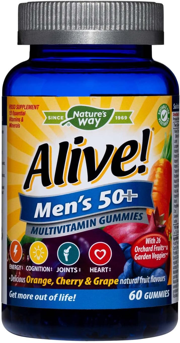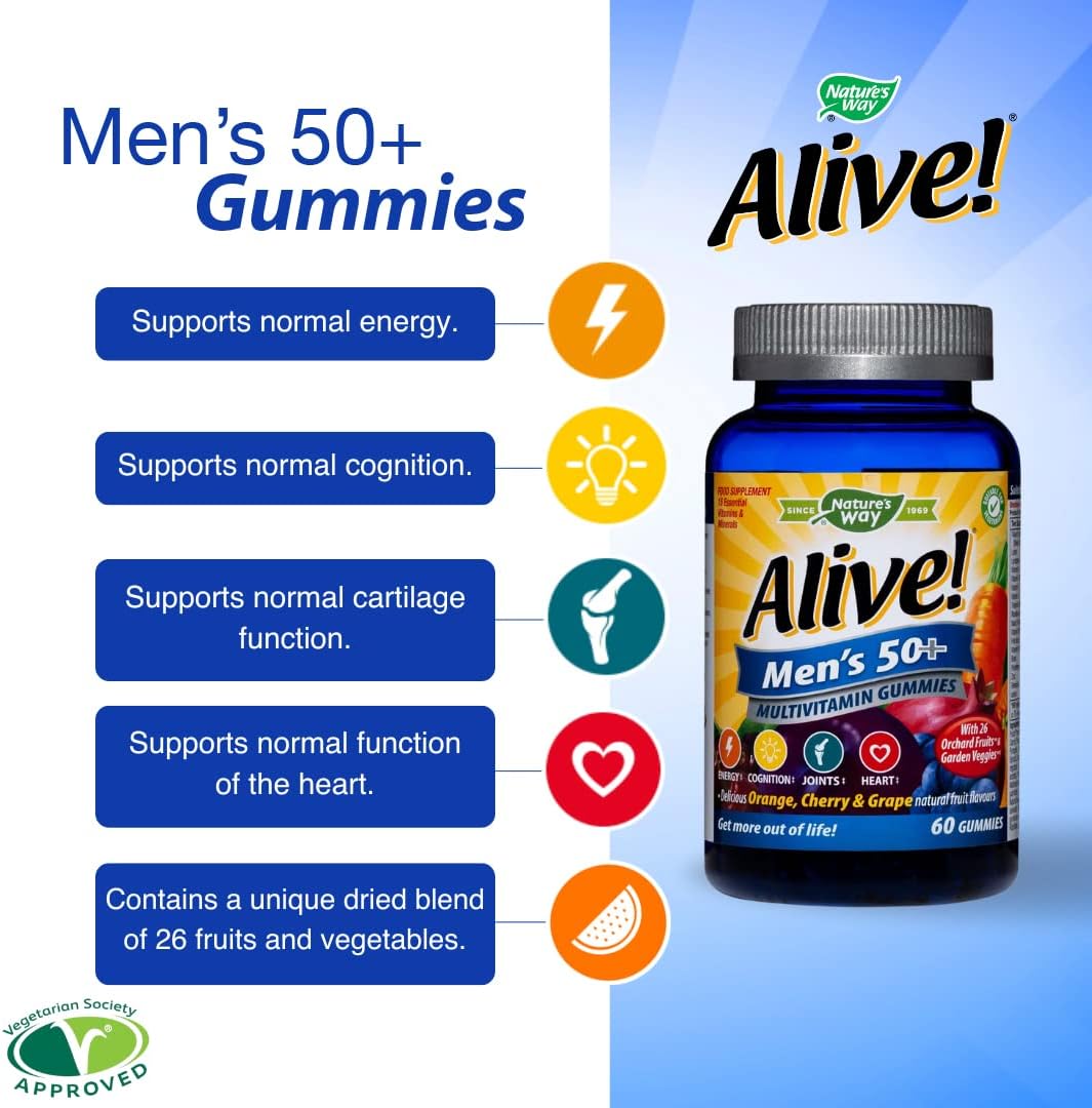 Alive! Men'S 50+ Multivitamin Gummies, A Unique Dried Blend Of 26 Fruits And Vegetables, Specially Formulated For Men Over Fifty, Suitable For Vegetarians - 60 Gummies