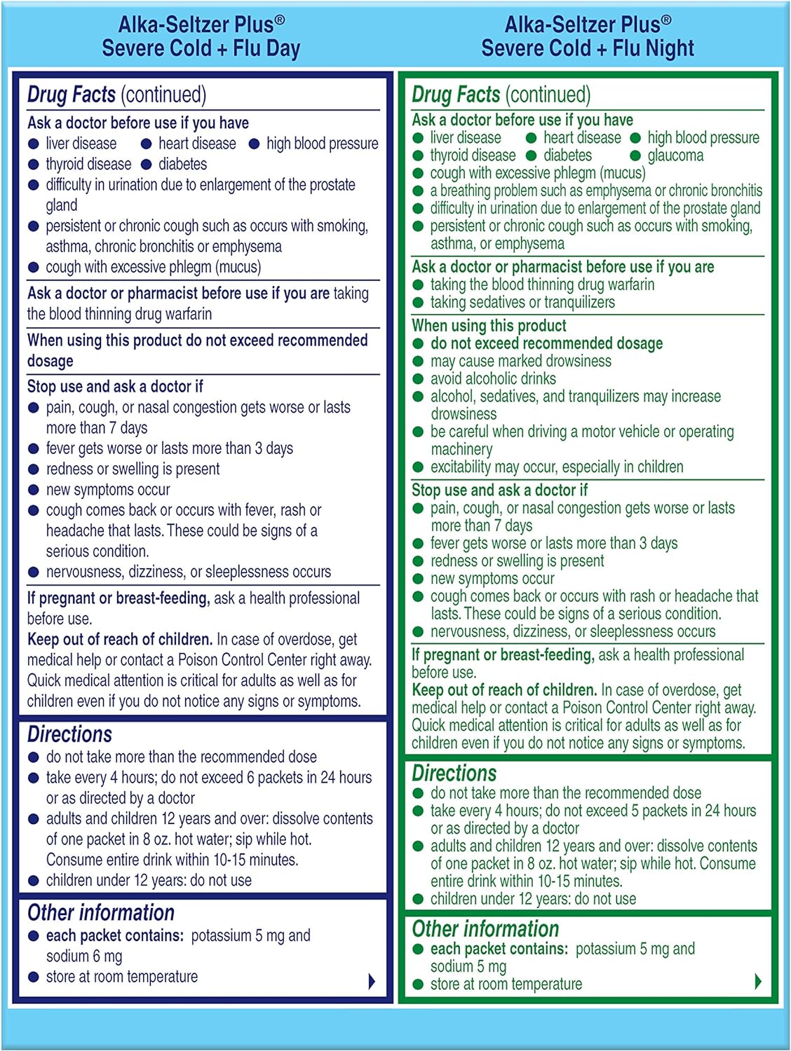 6 day formula packets6 night formula packetsHoney lemon flavor12 packetsalka-seltzer Plus Heavy Day Berry Fusion Night Cold And Flu, Cough & Honey Lemon Zest. New co-pack. Fast relief session packages. Acetaminophen / Pain reliever fever reducer. Phenylephrine HCL / Nasal Decongestant. Dextromethorphan HBR / cough suppressant. Stuffy nose. To cough. Head + body pain. Relieve sore throat. Acetaminophen / Pain reliever fever reducer. Phenylephrine HCL / Nasal Decongestant. Diphenhydramine HCl / Antihistamine cough suppressant. Stuffy nose. Hives. To cough. Head + body pain. Relieve sore throat. Bayer. 6 packages day + night packages. Covered by the Bayer HealthCare LLC – Consumer Health 60-Day Satisfaction Guarantee. See below for details