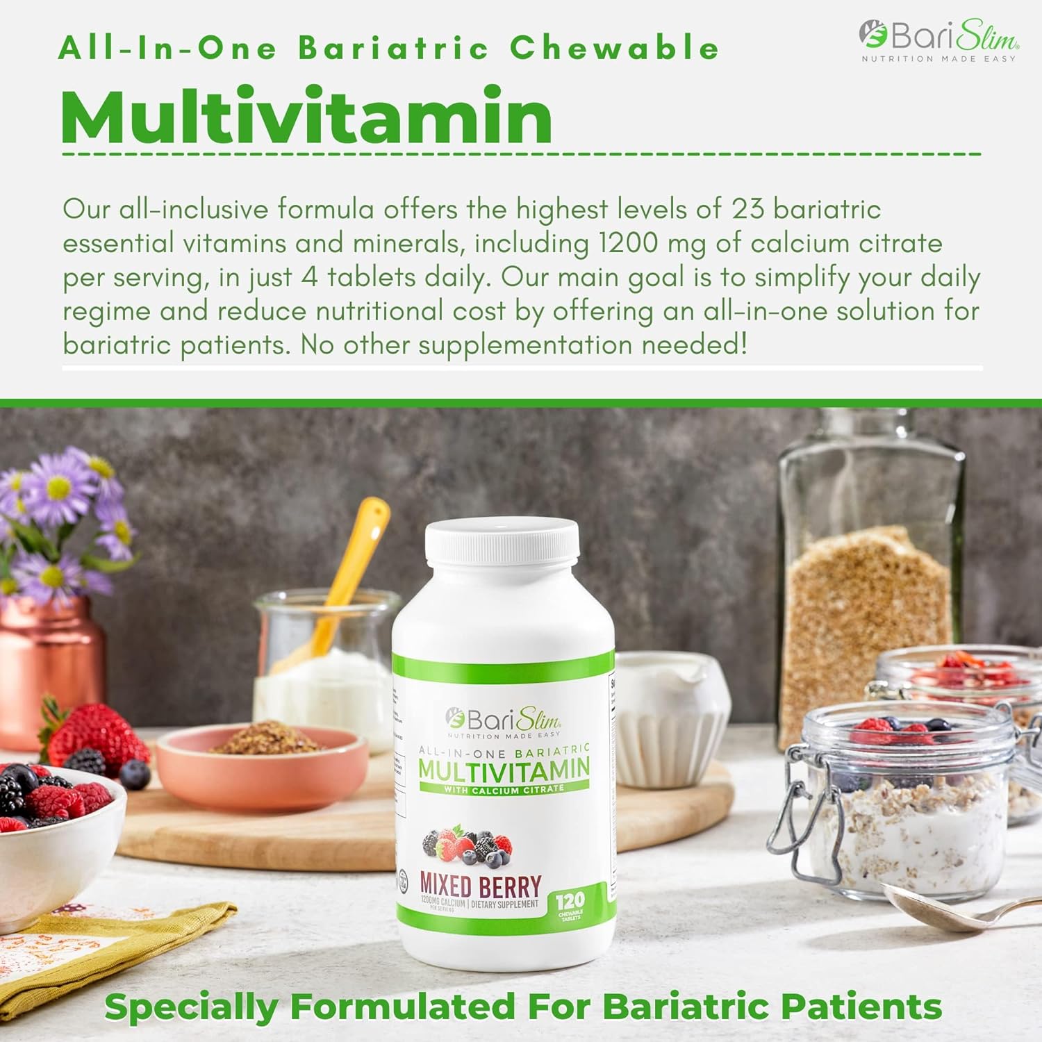 ??Complete Bariatric Nutrition?: BariSlim's All-in-One Bariatric Chewable Multivitamin Tablets are specially designed to meet the unique nutritional needs of post bariatric surgery patients, including Gastric Bypass, Gastric Sleeve, and Lap Band surgery. These bariatric vitamins provide comprehensive support, ensuring you get all the essential vitamins and minerals required for your health and well-being??Essential Calcium Support?: These bariatric chewable vitamin tablets are rich in calcium citrate, with each tablet providing 1200 mg of this essential mineral. Calcium citrate plays a crucial role in maintaining strong bones and preventing deficiencies, which are common concerns for individuals post bariatric surgery. BariSlim ensures your body gets the calcium it requires??Delectable Mixed Berry Flavor?: Bid farewell to the unpleasant taste of conventional vitamins. BariSlim's All-in-One Bariatric Multivitamin Chewable Tablets feature a delightful mixed berry flavor that transforms your daily supplement regimen into a pleasurable experience. No more struggling with swallowing pills – now you can eagerly anticipate your daily dose of vital nutrients??Consistent Daily Convenience?: BariSlim's 120-count bottle ensures a steady supply of essential nutrients, making it effortless to adhere to your post bariatric supplements routine. Enjoy the convenience of unwavering support for your health and well-being without the hassle of frequent replenishment??Your Trusted Health Partner?: BariSlim is more than a brand; we're your unwavering support on your path to a healthier life post-bariatric surgery. We're dedicated to your well-being, providing top-quality supplements made in the USA, adhering to strict safety standards. With us, you're not just taking a vitamin; you're taking a step toward a healthier, more vibrant you. Count on us to guide you on this transformative journey to better health