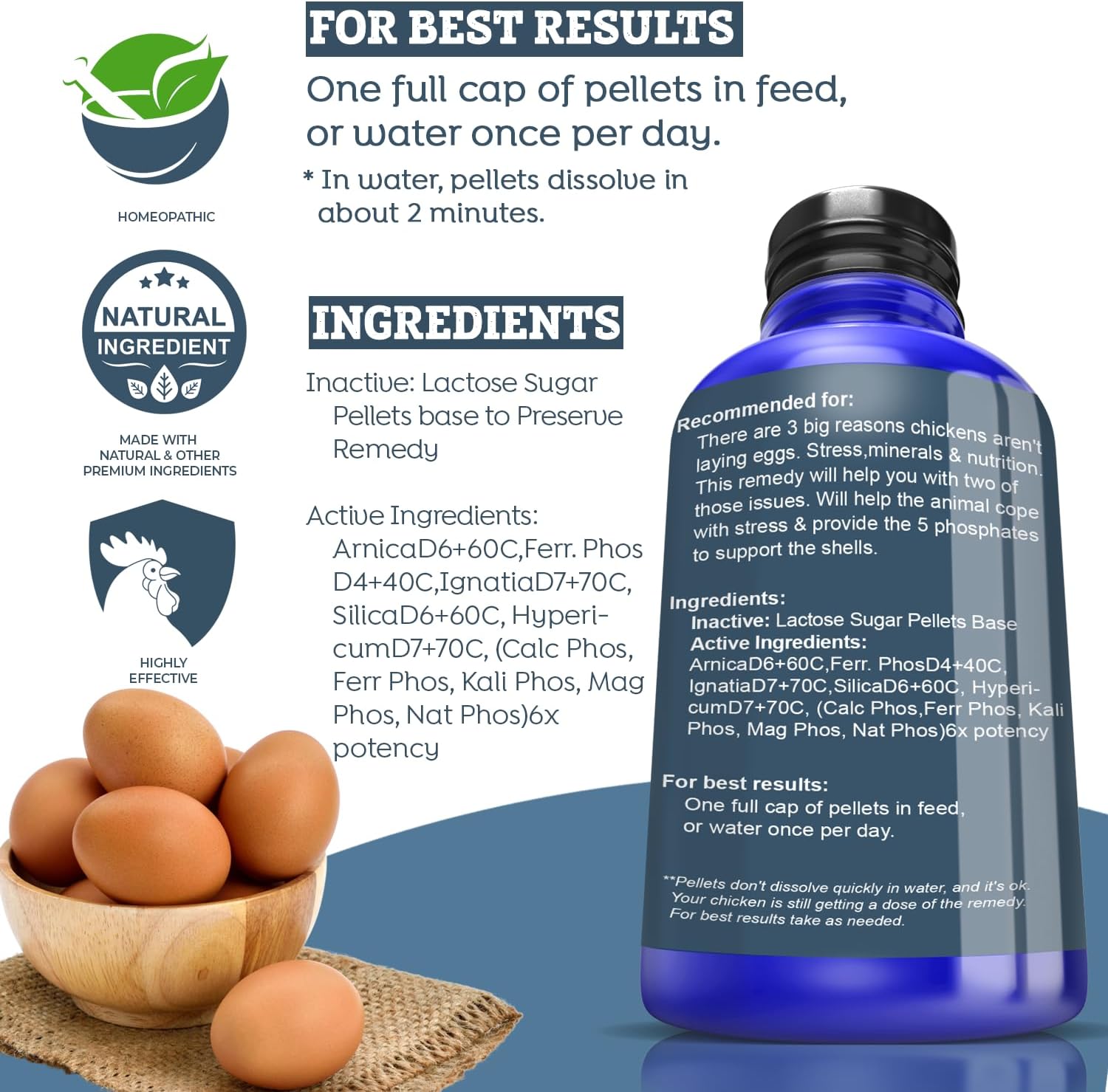 COMBAT STRESS EFFECTIVELY: Stress is a notorious egg-production disruptor. Our remedy may serve as a stress reliever, aiding chickens in coping with environmental changes or any factors causing stress. This not only promotes their well-being but also encourages consistent egg-layingMINERAL BOOST FOR THE SHELL: The absence of essential minerals can ruin eggshell formation. Our Egg Booster contains a powerful formula, ensuring the optimal support required for strong and healthy eggshellsGOOD CHICKEN CARE: Regular use of HealthyAnimals4Ever Egg Booster may contribute to long-term reproductive wellness, providing your flock with the tools they need to consistently lay healthy eggs. Simply add one cap full of remedy into your chicken's drinking water for hassle-free consumption, or mix with their favorite feedNATURAL AND HOLISTIC APPROACH: Choose the natural path to enhance egg production. Free from synthetic additives and chemicals, our remedy embodies a holistic approach to poultry care, promoting your flock's overall health and vitality