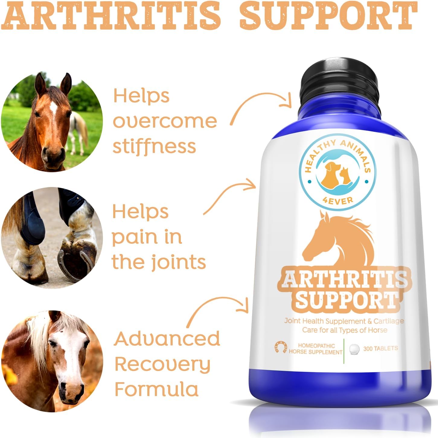 ADVANCED RECOVERY FORMULA: Provide unparalleled healing and recovery for your horse's Arthritis condition with our scientifically developed formula. Specially crafted to address Arthritis, our horse supplement helps overcome stiffness, pain in the joints, and other symptoms commonly found in older horses. Put your beloved pets' health first with Healthy Animals 4Everās All-Natural Horse Arthritis SupportQUICK RECOVERY: Ensure continuous care and support for your equine companion with our generous 300 count supply. Experience a full month of effective, lasting Arthritis management without any interruptions. Using this horse supplement consistently will ensure help improve health and balance for all of your horsesEASY APPLICATION: No fuss or stress during administration. Our dissolvable pellets are effortless to administer. Simply add a cap of pellets to your horse's drinking water for hassle-free consumption, or mix with their favorite feedSAFE SUPPLEMENTS FOR YOUR BELOVED PETS: Have complete peace of mind as you care for your pets with this all-natural, organic, non-GMO, gluten free, preservative free, and chemical free supplement. Developed with the same care and quality youād expect from your own supplements, this specially designed pet formula was carefully crafted in an FDA registered facility to ensure the highest possible standards