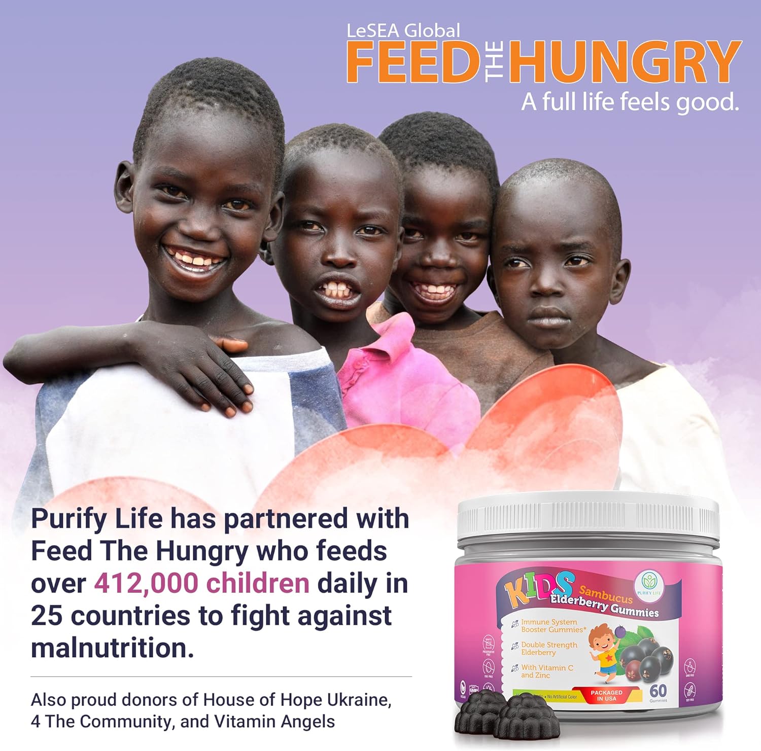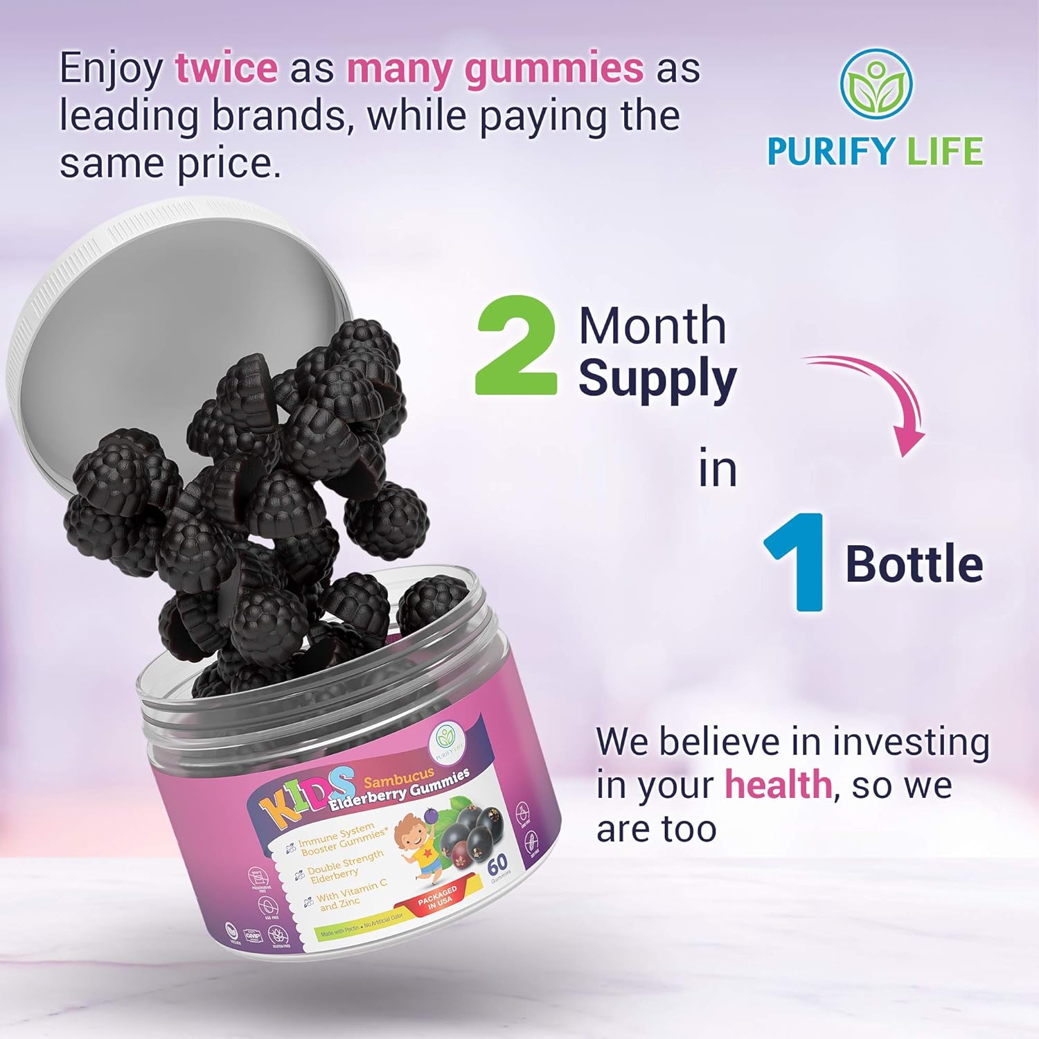[Extended Supply for Long-lasting Immune Support] – Each jar of our Purify Life sambucus elderberry gummies for kids brims with 60 servings, ensuring a continuous 2-month supply. This means your child gets sustained immune support, making our offering twice as beneficial as other leading brands on the market[Triple-action Antioxidant Blend] – Our elderberry chews go beyond the ordinary with a potent blend of elderberry, zinc, and vitamin C. This unique combination delivers a powerful punch of antioxidants and flavonoids, supporting your child's immune system to naturally combat common colds, coughs, sniffles, itchy throat, congestion, flu and maintain optimal health & respiratory function[Safe & Enjoyable for All Ages] – With a texture designed for easy chewing and swallowing, these gummies are ideal for infants, toddlers, kids, and even teenagers. This vegan, sambucus black elderberry isn't just immune support—it's also a treat that your entire family will appreciate, making daily supplementation a breeze[Uncompromised Quality & Taste] – We pride ourselves on our clean ingredient list: no gluten, no pectin, and no artificial colors. Our hypoallergenic and natural black elderberry gummies aren’t just safe—it's also irresistibly tasty, making it a hit with kids![Low-Sugar, High-Protection] – Purify Life kept the sugar low to respect your child's dietary needs while still ensuring a great taste. Each serving of our elderberry gummies supports your child's defense system for a full 60 days, allowing your family to savor the fall/winter season together, free from worry about common cold symptoms