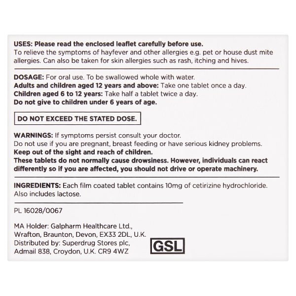 Product Information:To Relieve The Symptoms Of Hayfever And Other Allergies E.G. Pet Or House Dust Mite Allergies. Can Also Be Taken For Skin Allergies Such As Rash, Itching And Hives,Features:Superdrug Hayfever &Amp; Allergy Relief Contains Cetirizine Hydrochloride, Which Belongs To A Group Of Drugs Called Antihistamines. These Medicines Help To Relieve The Symptoms Of Some Allergies. This Medicine Is Used To Relieve: - Symptoms Of Hayfever And Other Allergies Such As Sneezing, Runny Nose And Burning, Itchy Eyes - Symptoms Of Skin Allergies Such As Rash, Itching Or Urticaria (Hives),Warning Or Restrictions:Do Not Take If You: - Are Allergic (Hypersensitive) To Cetirizine Hydrochloride Or Any Of The Other Ingredients In The Medicine, Listed In Section 6. - Have Serious Kidney Problems. Talk To Your Doctor Or Pharmacist Before Taking This Medicine If You: - Have Epilepsy Or Are At Risk Of Convulsions. - Have Predisposition Factor Of Urinary Retention (E.G. Spinal Cord Lesion Or Prostatic Hyperplasia) As Cetirizine Increases The Risk Of Urinary Retention. Taking This Medicine With Food And Drink - Avoid Alcoholic Drink While You Are Taking This Medicine. Pregnancy And Breast-Feeding - Do Not Take If You Are Pregnant Or Breast-Feeding. Driving And Using Machines - Tests Have Shown That This Medicine Does Not Cause Drowsiness In The Vast Majority Of People Using It. Therefore It Will Not Normally Affect Your Ability To Drive Or Operate Machinery. However There May Be Very Rare Exceptions And If You Experience Dizziness, Nausea Or Drowsiness, Do Not Drive Or Operate Machinery. Important Information About Some Of The Ingredients In Your Medicine - This Product Contains Lactose. If You Have Been Told By Your Doctor That You Have An Intolerance To Some Sugars, Contact Your Doctor Before Taking This Medicinal Product. Allergy Testing If You Are Due To Have An Allergy Test, Ask Your Doctor If You Should Stop Taking Superdrug Hayfever &Amp; Allergy Relief For Several Days Before Testing. This Medicine May Affect Your Allergy Test Results. Taking Other Medicines - Superdrug Hayfever &Amp; Allergy Relief Is Not Expected To Interact With Other Medicines You May Be Taking. However If You Are Unsure Talk To Your Pharmacist Or Doctor,Product Specification:What Is In This Medicine: The Active Ingredient Is: Cetirizine Hydrochloride, 10 Mg Per Tablet. The Other Ingredients Are: Lactose, Microcrystalline Cellulose, Colloidal Anhydrous Silica, Magnesium Stearate, Hypromellose (E464), Macrogol, Titanium Dioxide (E171) And Polydextrose,Product Uses:Adults And Children Aged 12 Years And Above: Take 1 Tablet Once A Day. Children Aged 6 To 12 Years: Take Half A Tablet Twice A Day. Do Not Give To Children Under The Age Of 6 Years. Do Not Exceed The Recommended Dose. If Symptoms Worsen Or Do Not Improve, Talk To Your Doctor Or Pharmacist. Always Read The Leaflet