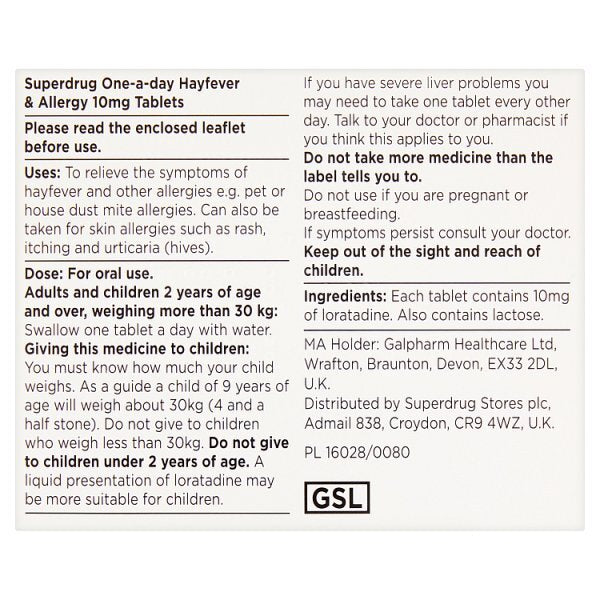 Product Information:Uses: To Relieve The Symptoms Of Hayfever And Other Allergies E.G. Pet Or House Dust Mite Allergies. Can Also Be Taken For Skin Allergies Such As Rash, Itching And Urticaria (Hives),Features:This Medicine Contains Loratadine, Which Belongs To A Group Of Drugs Called Antihistamines. These Medicines Help To Relieve The Symptoms Of Some Allergies. This Medicine Is Used To Relieve: - Symptoms Of Hayfever And Other Allergies Such As Sneezing, Runny Nose And Burning, Itchy Eyes - Symptoms Of Skin Allergies Such As Rash, Itching Or Urticaria (Hives),Warning Or Restrictions:Safety Warning: Always Read The Label Do Not Give To Children Under The Age Of 2 Years Or Weighing Less Than 30 Kg. If You Have Severe Liver Problems You May Need To Take One Tablet Every Other Day. Talk To Your Doctor Or Pharmacist If You Think This Applies To You. Do Not Exceed The Stated Dose Do Not Use If You Are Pregnant Or Breastfeeding. If Symptoms Persist Consult Your Doctor. Keep Out Of The Sight And Reach Of Children,Product Specification:What Is In This Medicine: The Active Ingredient Is: Loratadine, 10 Mg Per Tablet. The Other Ingredients Are: Lactose Monohydrate, Maize Starch, Pregelatinised Starch And Magnesium Stearate,Product Uses:Adults And Children 6 Years Of Age And Over: Swallow One Table Daily With Water. Do Not Give To Children Under 6 Years Of Age Or To Children Weighing Less Than 30Kg