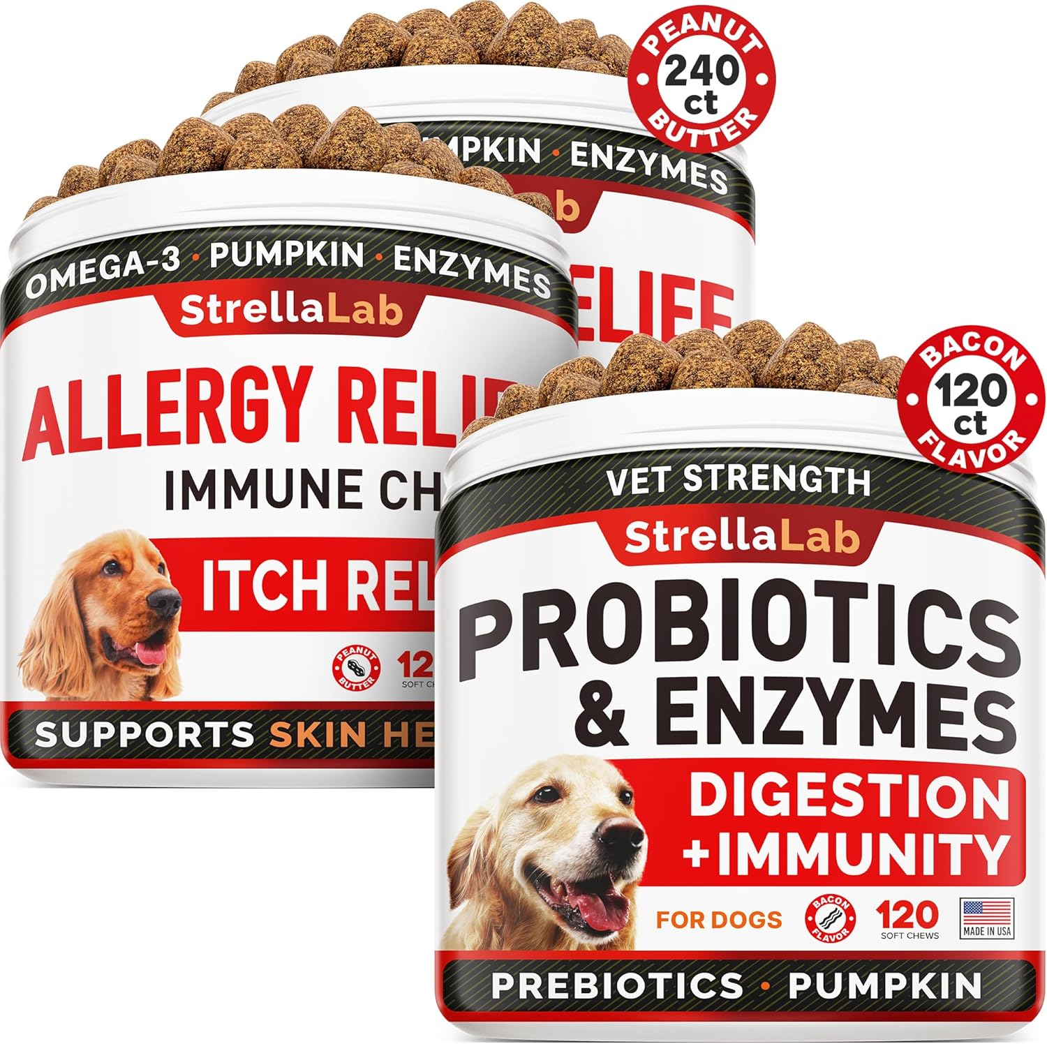 Allergy Relief 2 Packs 240 Ct + Vet Strength Probiotics - 120Ct Dogs Bundle - Dog Itchy Skin Treatment - Omega3 & Pumpkin + Digestive Enzymes + Prebiotics - Diarrhea, Gas, Constipation - Made In Usa