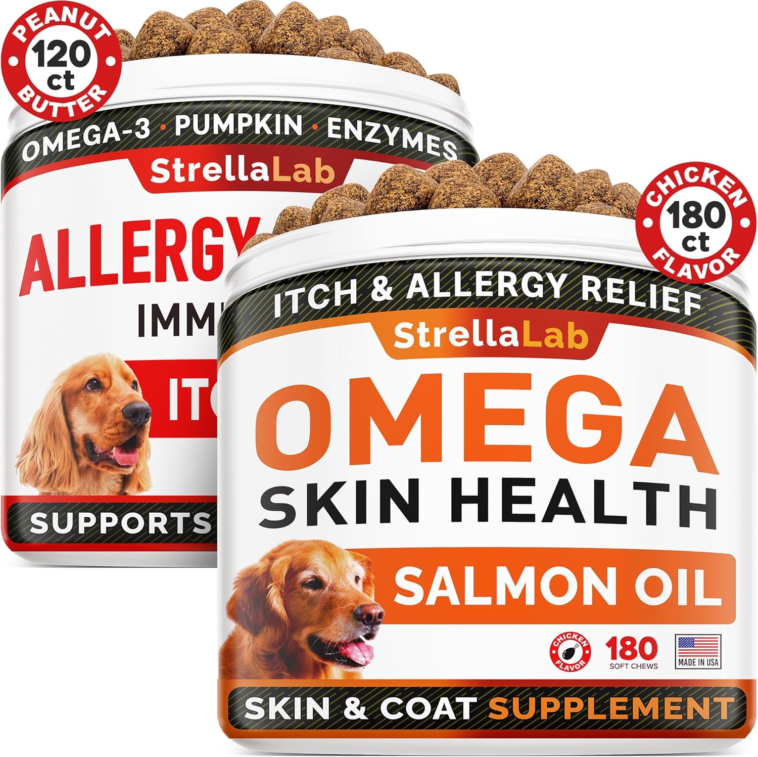 Allergy Relief + Omega 3 Dogs Bundle - Itchy Skin Treatment + Allergy & Itch Relief Skin&Coat Supplement - Omega3 & Pumpkin - Dog Itch Relief - 300 Chews - Peanut Butter + Chicken Flavor - Made In Usa
