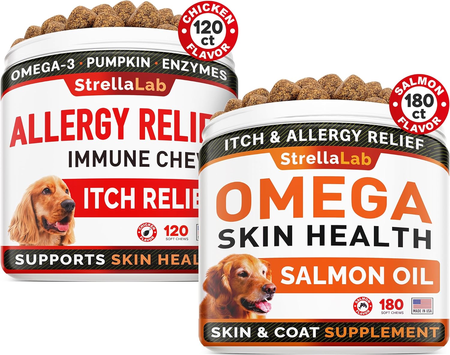 Allergy Relief + Omega 3 Dogs Bundle - Itchy Skin Treatment + Allergy - Omega 3 & Pumpkin - Dogs Itching And Licking Treats + Dry Itchy Skin, Shedding - 300 Ct - Salmon + Chicken Flavor - Made In Usa