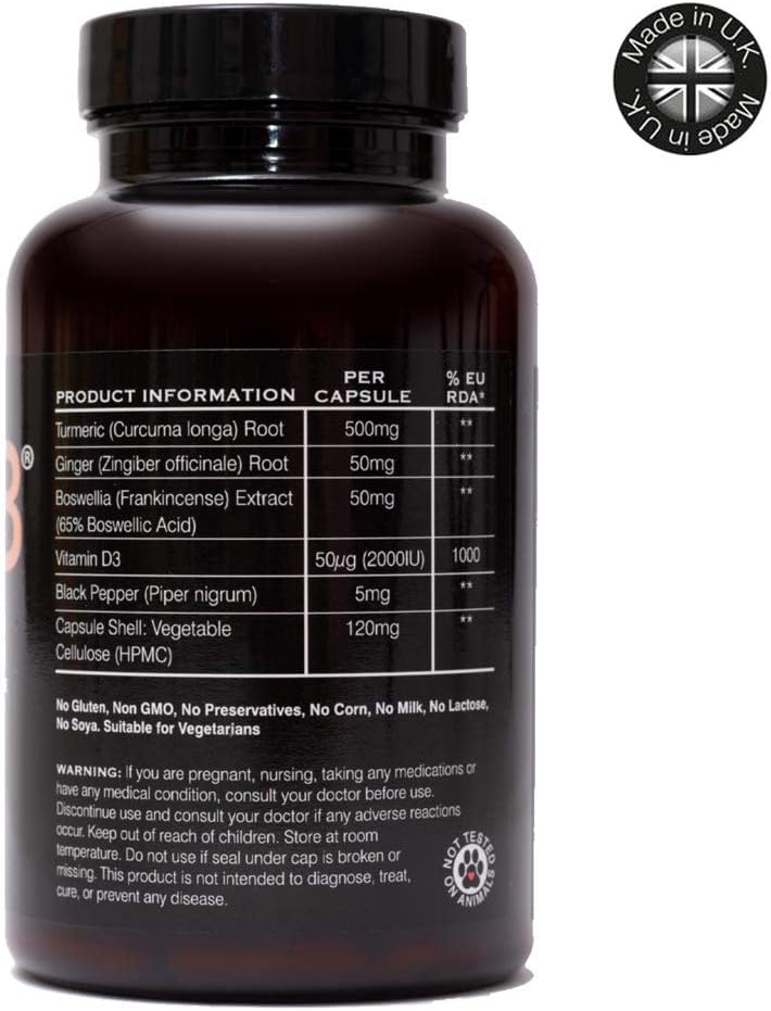 HIGHEST QUALITY INGREDIENTS - Our capsules contain Turmeric powder enriched with Black Pepper (Piperine) to increase the absorption of Curcumin (the active ingredient in Turmeric). Furthermore we include Ginger, Frankincense and vitamin D. These are vegan and vegetarian-friendly and contain NO excipients, fillers or binders. non-GMO and allergen-freeAYURVEDA SUPPLEMENTS - Contains natural ingredients for enhanced wellness. An excellent booster for mind, body, and soul, promoting overall well-beingQUALITY CONTROL - & PREMIUM INGREDIENTS - This product is made in the UK by MHRA approved factoryWHATS INSIDE - Turmeric Root 500mg , Ginger Root 50mg, Frankincense Extract 50mg , Vitamin D3 20mg, Black Pepper (Piper nigrum) 5mg , Capsule Shell: Vegetable CelluloseMIND: Great for your Mind Body and Soul Powerful Ayurvedic Herbs and Spices with Health BenefitsUnlock the age-old secrets of wellness with ALLEVI8 Mind, Body & Soul. This comprehensive natural supplement, infused with potent ingredients like Frankincense Boswellia serrata, Turmeric (Curcuma longa), Ginger, Black Pepper, and Vitamin D3, Each of these powerful ingredients have been celebrated for their properties for millennia. They have held esteemed positions in the systems of ancient cultures, like the Greeks, Indians, and Egyptians. These very components have been an indispensable part of Ayurvedic benefits for over 3,000 years. Imagine harnessing this age-old wisdom and incorporating it into your daily routine, providing your body with the nurturing it truly deserves. With ALLEVI8 Mind, Body & Soul, you're not just choosing a supplement. You're choosing a lifestyle steeped in ancient wisdom, one that acknowledges the power of natural ingredients in supporting your overall wellness. So why wait any longer? Give yourself the gift of an age-old tradition and experience the holistic benefits of ALLEVI8 Mind, Body & Soul. The time to prioritize your health and wellbeing is now. Let this remarkable blend be your faithful companion in your journey towards a healthier you. Try ALLEVI8 Mind, Body & Soul today, and feel the difference