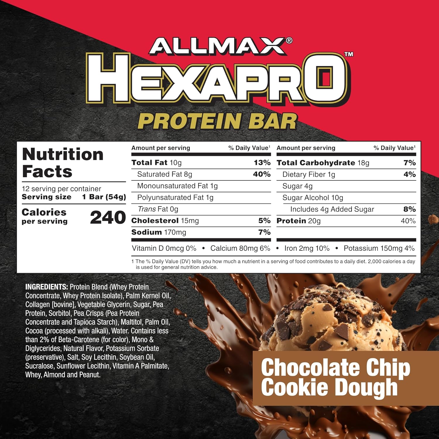 Allmax Hexapro Protein Bar, Chocolate Chip Cookie Dough - Pack Of 12 - High-Protein Energy Snack - 20 G Of Protein Per Bar - With Whey Protein Isolate