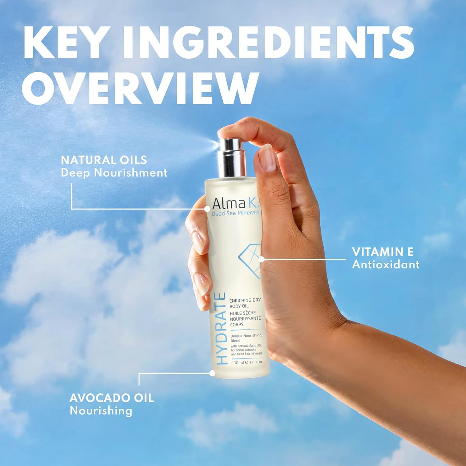 About this item Natural Ingredients: Alma K Enriching Dry Body Oil spray features avocado, olive, argan, and sweet almond oils, combined with vitamin E and Dead Sea minerals. This blend nourishes the skin, providing hydration and promoting a silky-smooth feel. White Tea and Neroli Scent: This moisturizing body oil for women is delicately scented with white tea and neroli, offering a subtle and refreshing fragrance. Enhance your skincare routine with a soothing aroma that lingers gently on the skin. Multi-Purpose Use: Not just for skin, this body oil spray can also be used on hair to boost shine and prevent frizz. It is a versatile body oil for dry skin, offering the benefits of a moisturizing oil for body and hair. Clean Skin Care: Alma K is dedicated to sustainable clean skincare that respects both your skin and the environment. With a focus on clean ingredients and practices, our personal care products are crafted to minimize their environmental impact. Made with Natural Oils and Dead Sea Minerals: Alma K skin care harnesses the power of 100 percent natural oils, botanical extracts, and Dead Sea minerals. With Alma K, you're treating your skin to the best nature has to offer. See more product details,Natural Ingredients: Alma K Enriching Dry Body Oil spray features avocado, olive, argan, and sweet almond oils, combined with vitamin E and Dead Sea minerals. This blend nourishes the skin, providing hydration and promoting a silky-smooth feel,White Tea and Neroli Scent: This moisturizing body oil for women is delicately scented with white tea and neroli, offering a subtle and refreshing fragrance. Enhance your skincare routine with a soothing aroma that lingers gently on the skin,Multi-Purpose Use: Not just for skin, this body oil spray can also be used on hair to boost shine and prevent frizz. It is a versatile body oil for dry skin, offering the benefits of a moisturizing oil for body and hair,Clean Skin Care: Alma K is dedicated to sustainable clean skincare that respects both your skin and the environment. With a focus on clean ingredients and practices, our personal care products are crafted to minimize their environmental impact,Made with Natural Oils and Dead Sea Minerals: Alma K skin care harnesses the power of 100 percent natural oils, botanical extracts, and Dead Sea minerals. With Alma K, you're treating your skin to the best nature has to offer