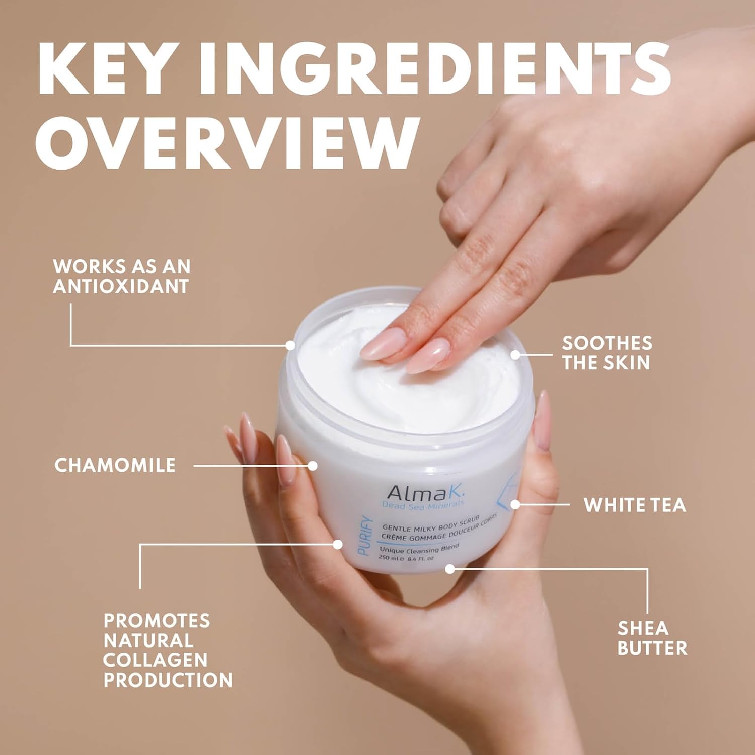 About this item Delicate Body Exfoliant : With nourishing plant oils, rich shea butter, and mineral-rich Dead Sea water, Alma K Gentle Milky Body Scrub effectively removes impurities and dead skin cells without stripping the skin of its natural moisture. White Tea and Neroli Scent: This gentle bath scrub is delicately scented with white tea and neroli, offering a subtle and refreshing fragrance. Enhance your skincare routine with a soothing aroma that lingers gently on the skin. Enriched with Shea Butter: With regular use, the shea butter in this body scrub exfoliator works to smooth and soften the skin, supporting its natural renewal process and revealing a firmer, more radiant texture. Clean Skin Care: Alma K is dedicated to sustainable skincare that respects your skin and the environment. With a focus on clean ingredients and practices, our beauty and personal care products are crafted to minimize their environmental impact. Made with Natural Oils and Dead Sea Minerals: Alma K skin care harnesses the power of 100 percent natural oils, botanical extracts, and Dead Sea minerals. With Alma K, you're treating your skin to the best nature has to offer. See more product details,Delicate Body Exfoliant : With nourishing plant oils, rich shea butter, and mineral-rich Dead Sea water, Alma K Gentle Milky Body Scrub effectively removes impurities and dead skin cells without stripping the skin of its natural moisture,White Tea and Neroli Scent: This gentle bath scrub is delicately scented with white tea and neroli, offering a subtle and refreshing fragrance. Enhance your skincare routine with a soothing aroma that lingers gently on the skin,Enriched with Shea Butter: With regular use, the shea butter in this body scrub exfoliator works to smooth and soften the skin, supporting its natural renewal process and revealing a firmer, more radiant texture,Clean Skin Care: Alma K is dedicated to sustainable skincare that respects your skin and the environment. With a focus on clean ingredients and practices, our beauty and personal care products are crafted to minimize their environmental impact,Made with Natural Oils and Dead Sea Minerals: Alma K skin care harnesses the power of 100 percent natural oils, botanical extracts, and Dead Sea minerals. With Alma K, you're treating your skin to the best nature has to offer