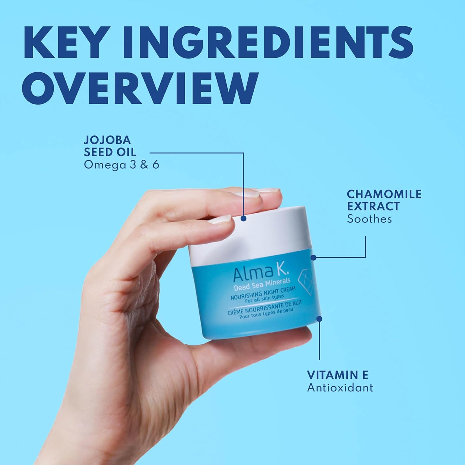 About this item Overnight Boost: A deeply comforting formula, this night cream for face hydration provides a soothing touch while you sleep. Enriched with nourishing ingredients, it restores moisture and calms the skin overnight. Nourishing Ingredients: The blend of Dead Sea minerals, shea butter, and jojoba seed oil in this face lotion nourishes the skin, delivering essential hydration throughout the night. Wake up to a healthier-looking complexion that looks radiant. Hydrating Night Cream for All Skin Types: This night face moisturizer for dry skin is thoughtfully crafted to cater to all skin types, providing a gentle yet effective solution for every complexion. Clean Skin Care: Alma K is dedicated to sustainable clean skincare that respects both your skin and the environment. With a focus on clean ingredients and practices, our personal care products are crafted to minimize their environmental impact. Made with Natural Oils and Dead Sea Minerals: Alma K skin care harnesses the power of 100 percent natural oils, botanical extracts, and Dead Sea minerals. With Alma K, you're treating your skin to the best nature has to offer. See more product details,Overnight Boost: A deeply comforting formula, this night cream for face hydration provides a soothing touch while you sleep. Enriched with nourishing ingredients, it restores moisture and calms the skin overnight,Nourishing Ingredients: The blend of Dead Sea minerals, shea butter, and jojoba seed oil in this face lotion nourishes the skin, delivering essential hydration throughout the night. Wake up to a healthier-looking complexion that looks radiant,Hydrating Night Cream for All Skin Types: This night face moisturizer for dry skin is thoughtfully crafted to cater to all skin types, providing a gentle yet effective solution for every complexion,Clean Skin Care: Alma K is dedicated to sustainable clean skincare that respects both your skin and the environment. With a focus on clean ingredients and practices, our personal care products are crafted to minimize their environmental impact,Made with Natural Oils and Dead Sea Minerals: Alma K skin care harnesses the power of 100 percent natural oils, botanical extracts, and Dead Sea minerals. With Alma K, you're treating your skin to the best nature has to offer