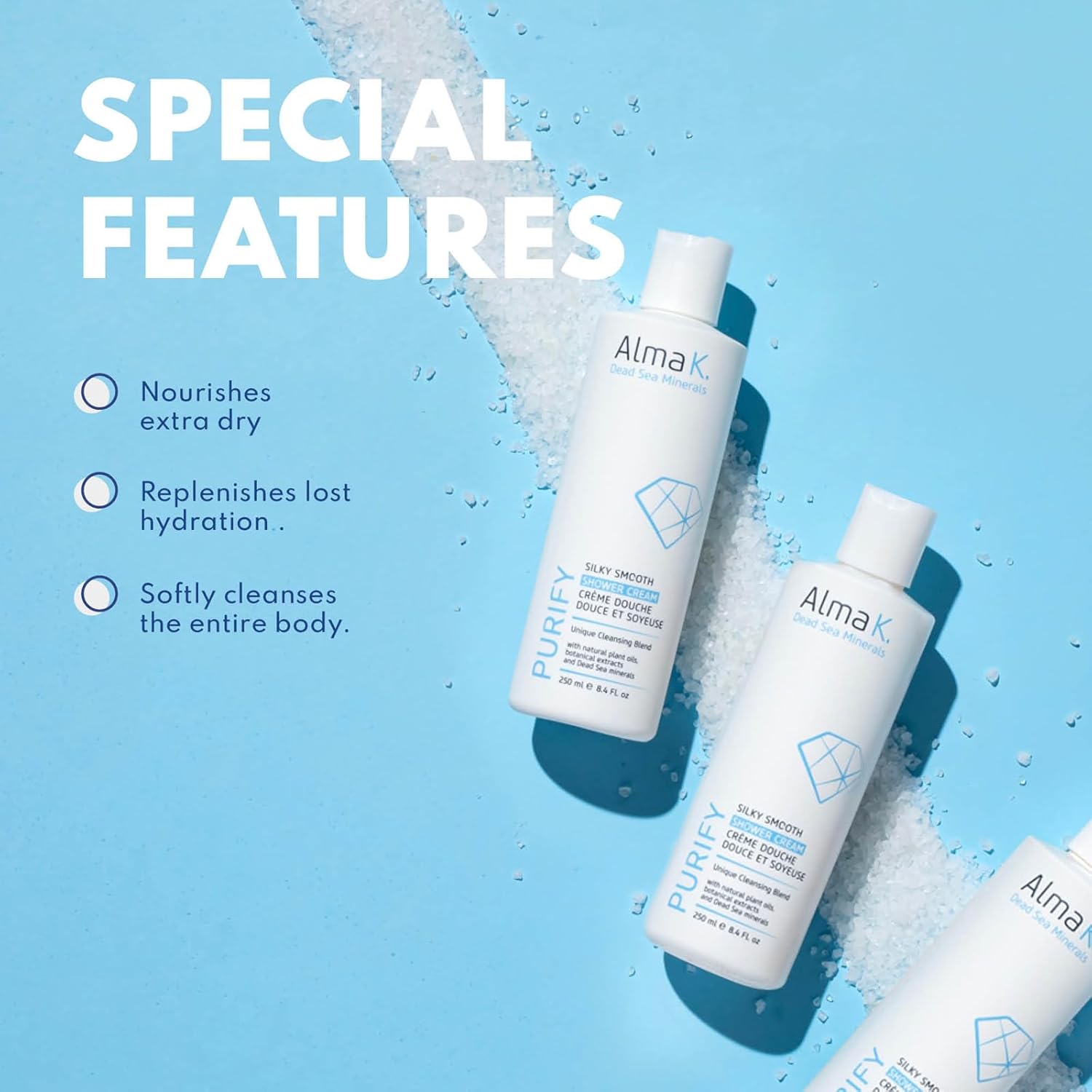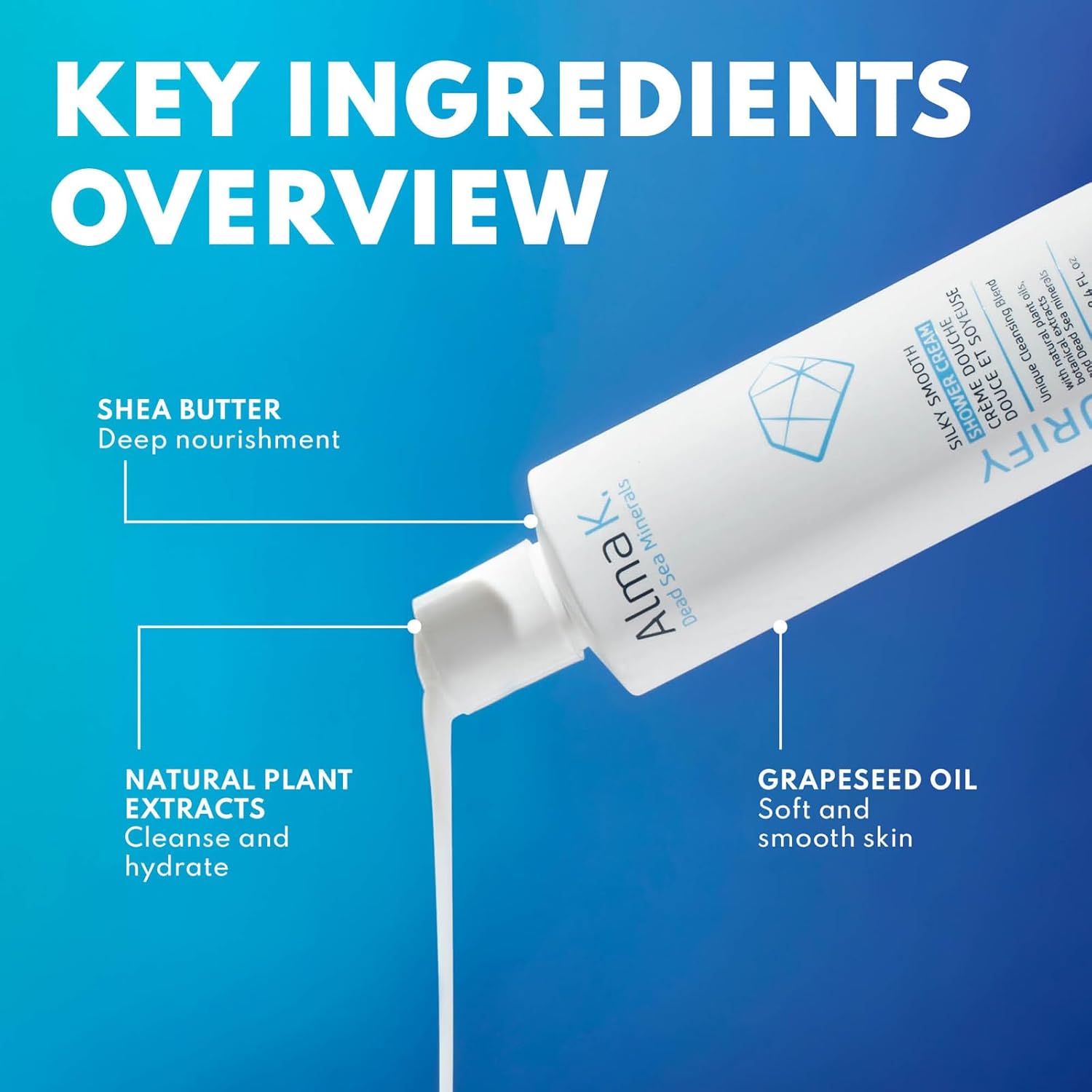 About this item Infused with Dead Sea Minerals: Experience the ultimate cleansing with our Silky Smooth Shower Cream, formulated with Dead Sea minerals, olive oil, and grape seed extract. This luxurious in shower body lotion nourishes and revitalizes your skin. Soft Lathery Cream: Our moisturizing body cream transforms into a soft, lathery texture, offering an exceptional in shower moisturizer that leaves your skin balanced and silky smooth. Charming Scent: Enjoy the enchanting aroma of white tea and neroli with our Silky Smooth Shower Cream. This wet skin lotion not only moisturizes but also indulges your senses, making it an ideal in shower lotion for women. Clean Skin Care: Alma K is dedicated to sustainable clean skincare that respects both your skin and the environment. With a focus on clean ingredients and practices, our personal care products are crafted to minimize their environmental impact. Made with Natural Oils and Dead Sea Minerals: Alma K skin care harnesses the power of 100 percent natural oils, botanical extracts, and Dead Sea minerals. With Alma K, you're treating your skin to the best nature has to offer. See more product details,Infused with Dead Sea Minerals: Experience the ultimate cleansing with our Silky Smooth Shower Cream, formulated with Dead Sea minerals, olive oil, and grape seed extract. This luxurious in shower body lotion nourishes and revitalizes your skin,Soft Lathery Cream: Our moisturizing body cream transforms into a soft, lathery texture, offering an exceptional in shower moisturizer that leaves your skin balanced and silky smooth,Charming Scent: Enjoy the enchanting aroma of white tea and neroli with our Silky Smooth Shower Cream. This wet skin lotion not only moisturizes but also indulges your senses, making it an ideal in shower lotion for women,Clean Skin Care: Alma K is dedicated to sustainable clean skincare that respects both your skin and the environment. With a focus on clean ingredients and practices, our personal care products are crafted to minimize their environmental impact,Made with Natural Oils and Dead Sea Minerals: Alma K skin care harnesses the power of 100 percent natural oils, botanical extracts, and Dead Sea minerals. With Alma K, you're treating your skin to the best nature has to offer