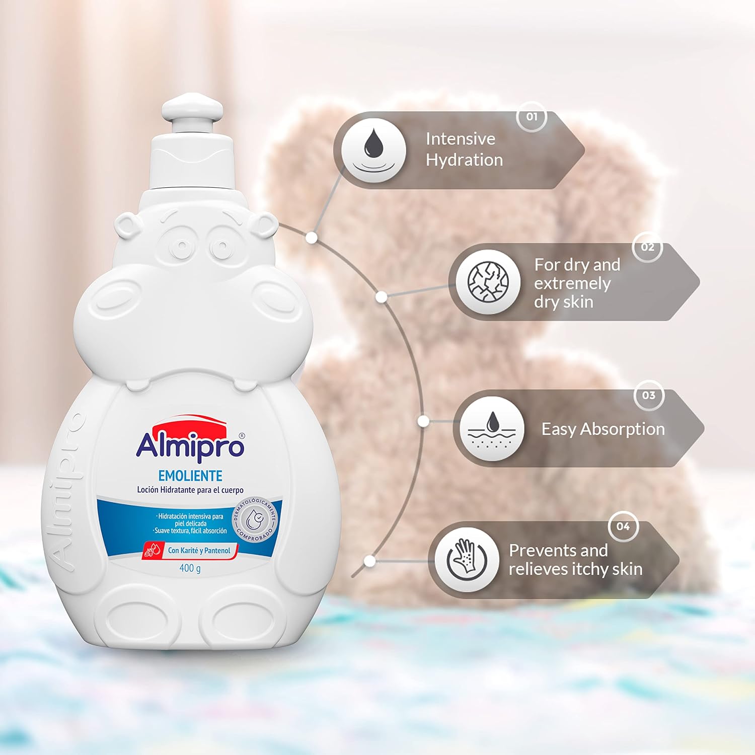 Hydrating Bliss for Delicate Skin: Almipro Baby Daily Lotion, a soothing hydrating lotion enriched with Panthenol and Shea Butter, offers intensive moisture for delicate baby skin. This gentle baby lotion is perfect for daily use10Smooth Texture, Easy Absorption: A daily moisturizing lotion with a smooth texture that effortlessly absorbs into baby's skin. Almipro's non-greasy formula ensures easy application, making it the ideal baby daily moisture lotion for both face and body103.Nourishing Blend for Baby's Skin Care: Unlock the power of natural ingredients with Almipro baby moisturizer Lotion. Shea Butter and Panthenol, key ingredients in this moisturizing lotion, work together to hydrate, repair, and restore, offering a daily lotion for dry skin that's perfect for baby skincare10Gentle Relief from Itching: Almipro Emollient lotion is your go-to solution for reducing itching caused by dryness. Specially developed for baby and child's skin, this baby lotion oatmeal-infused formula restores the skin's texture, leaving it soft and smooth10Daily Hydration Routine for Kids: Elevate your kids' skincare routine with Almipro Baby Daily Lotion, a trusted body lotion for kids. Use this daily moisturizing lotion for body and face at least twice a day for optimal results, ensuring your little one's skin stays moisturized, healthy, and happy