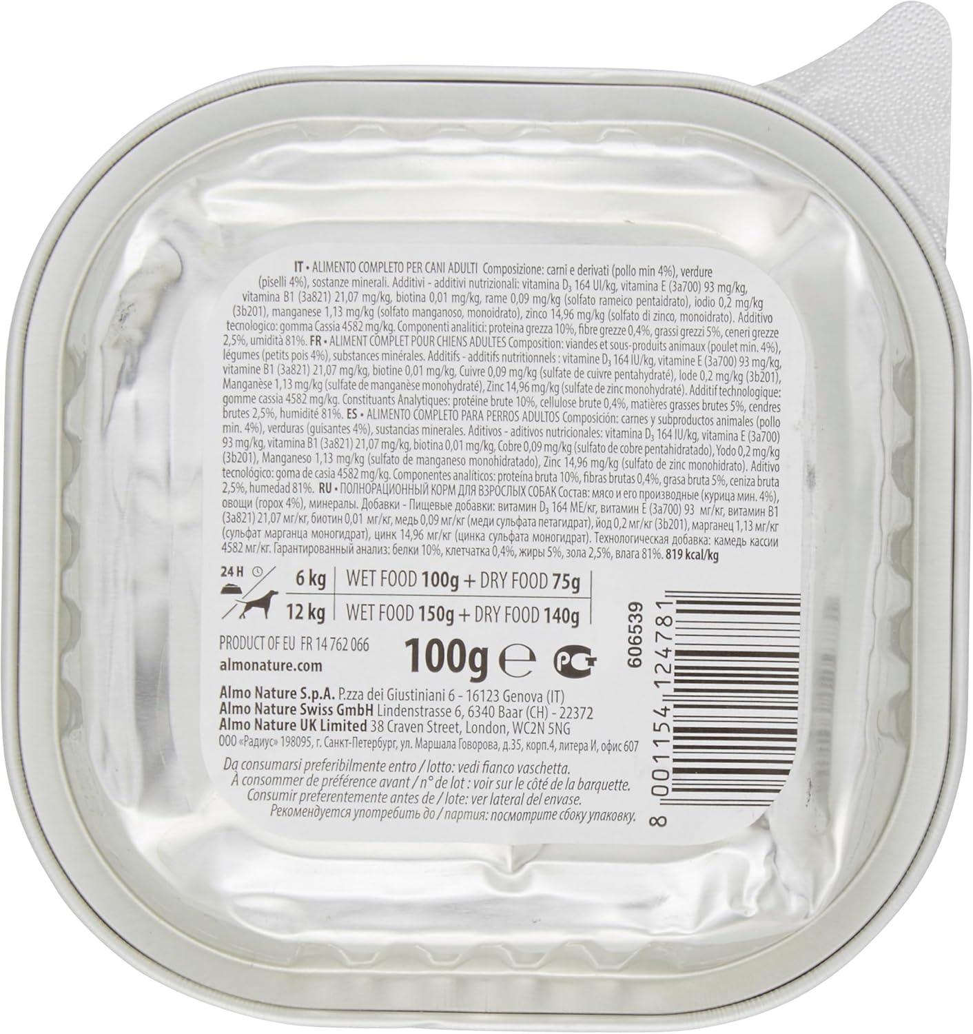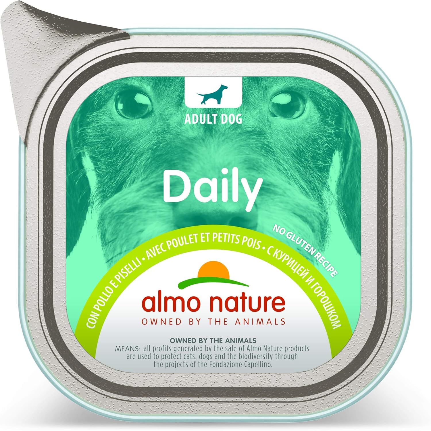Product Description The Daily Menu recipes are prepared with ingredients suitable only for pet food. The entire range has no artificial colours or preservatives. Dailymenu recipes ensure through our Almo Nature quality guarantee that you are providing a complete diet, at an even more convenient price! Ingredients Meat and meat derivatives (chicken 4%), vegetables (of which peas 4%), minerals. Nutritional additives: Vitamin E 118mg/kg, Vitamin D3 205 IU/kg Technological additive: cassia gum 2679 mg/kg Analytical constituents: Crude protein 10%, Crude fibres 0,8%, Crude oils and fats 5%, Crude ash 2,5%, Moisture 81% P.when('A').execute(function(A) { A.on('a:expander:toggle_description:toggle:collapse', function(data) { window.scroll(0, data.expander.$expander[0].offsetTop-100); }); }); Directions Suggested daily serving: Adult Dog 10kg: 140g wet food + 120g dry food -- Adult Dog 20kg: 140g wet food + 210g dry food -- Adult Dog 40kg: 140g wet food + 380g dry food Box Contains 32 x100g Almo Nature Daily Menu Dog No grain with Chicken and Peas See more