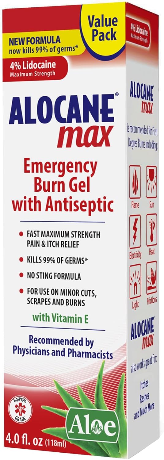 Alocane Max Emergency Burn Gel, 4% Lidocaine Hydrochloride, .13% Benzalkonium Chloride, Maximum Strength Relief, Itch Relief, For Sunburns, Kitchen, Radiation, Chemical, First-Degree Burns, 4 Fl Oz