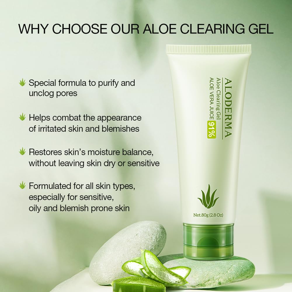 Aloderma Acne Clearing Gel for Clear Complexion with 91% Organic Aloe Vera - Moisturizing, Non-Drying Blemish Spot Treatment Gel with Witch Hazel - Soothing, Skin Calming Aloe for Acne Control, 2.8oz