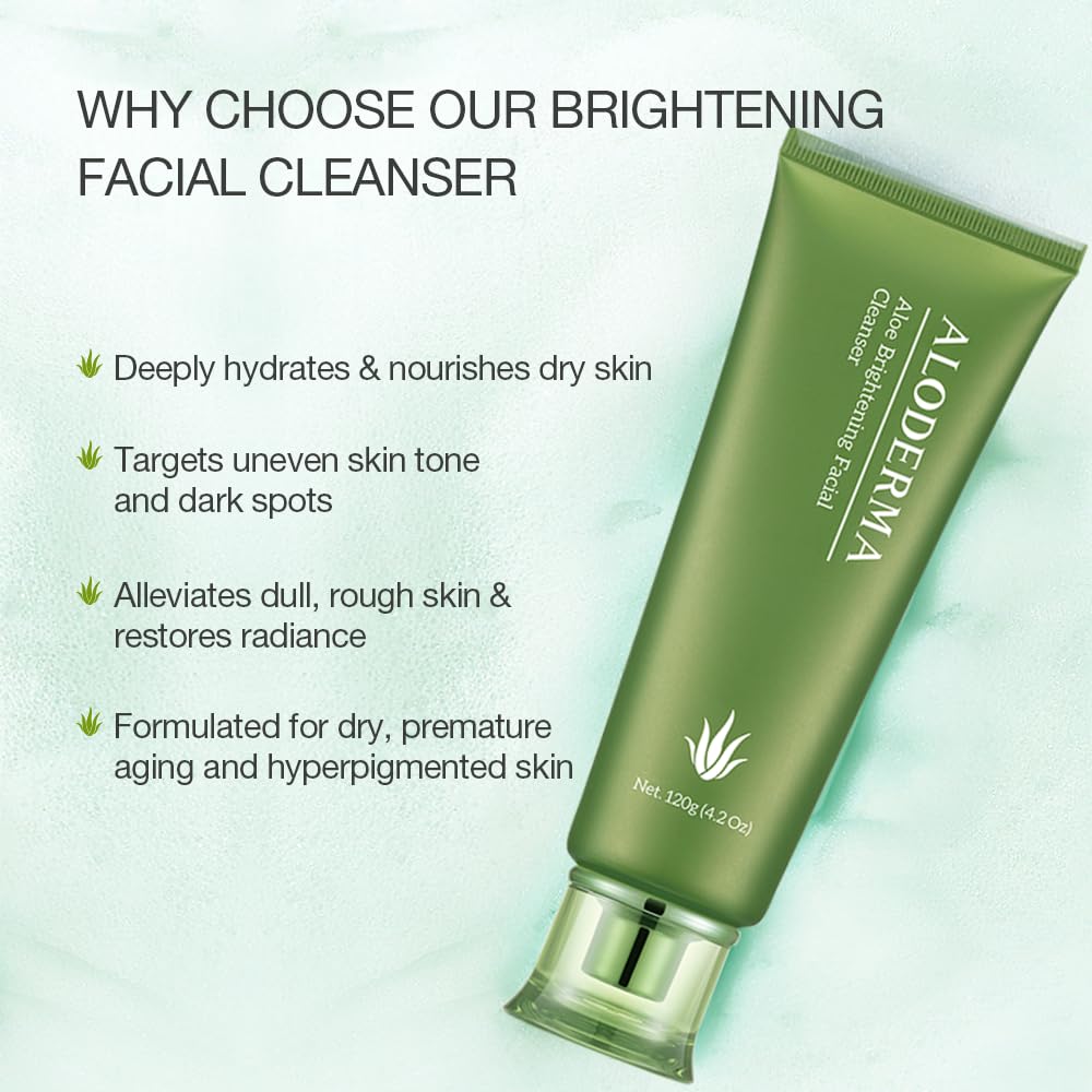 Natural Radiance: Our face wash for oily skin for women & men is a great way to revitalize your skin. Remove impurities and reveal your skinās natural radiance with our brightening cleanser, restoring your skin's vitality and leaving it clean and hydratedNourishing Daily Care: Our gentle natural formula enhances skin's appearance and texture, leaving you with a clear, even complexion. Our gentle skin cleanser is great for sensitive skin, providing a natural and effective option for daily useBrighten Your Complexion: Experience the gentle touch of our aloe vera cleanser, providing soothing relief for your skin. The gentle foaming formula deeply cleanses while brightening and rejuvenating the skin for a clear, glowing complexionMade Within 12 Hours of Harvest: At Aloderma, our skincare is rooted in the earth. Our Aloe is processed on-site and turned into final products within hours of leaving the fields to ensure that we capture the natural power of Aloe Vera in every product we makeAloderma: We are a family run farm-to-face skin care line focused on producing and creating high-quality organic aloe vera-based products in an ecologically friendly way. We grow organic aloe vera on our own farms and manufacture all of our products in our factory, which are certified USDA and European Union organic by ECOCERT. Aloderma has over 20 years of working with Aloe providing high quality and affordable products for beauty, health and wellnessAloderma Skin Brightening Face Cleanser Made with 77% Organic Aloe Vera - Natural Brightening Daily Face Wash with Licorice for Radiant Skin - Gentle, Nourshing Formulf for Everyday Use, 4.2oz