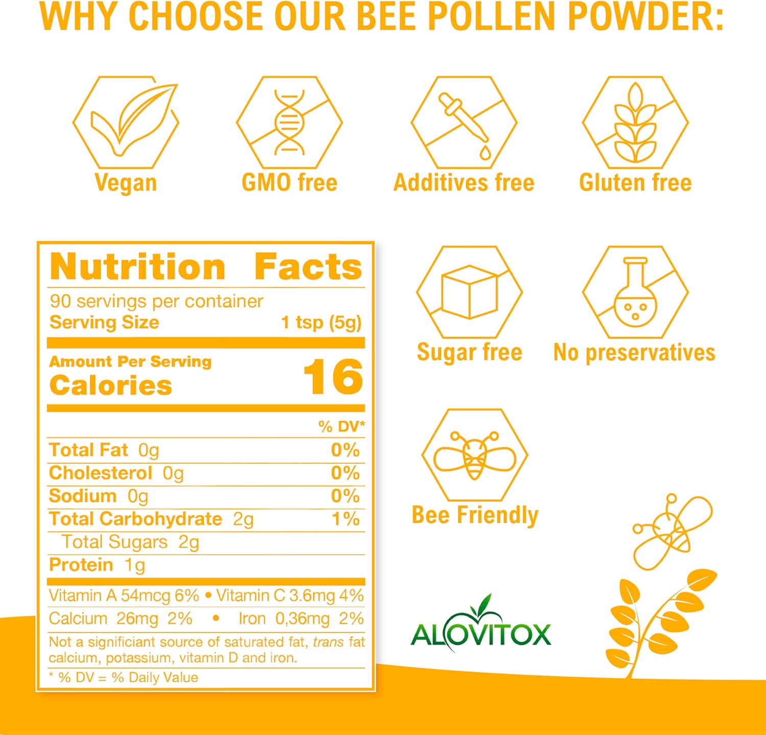 Alovitox Fresh Bee Pollen Powder | 100% Pure, Fresh, Raw | Supports The Immune System | Proteins, Vitamins B6, B12, C, A | Gluten Free, Non-Gmo | 16 Oz